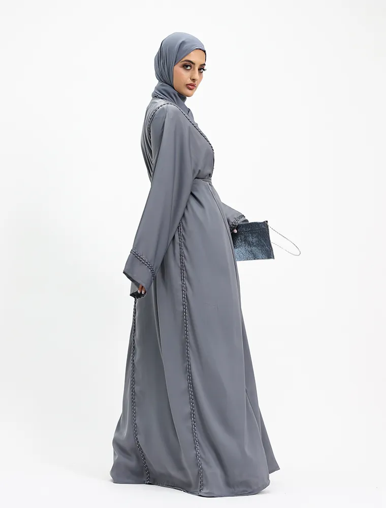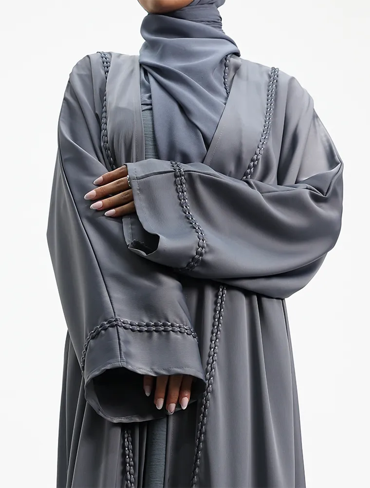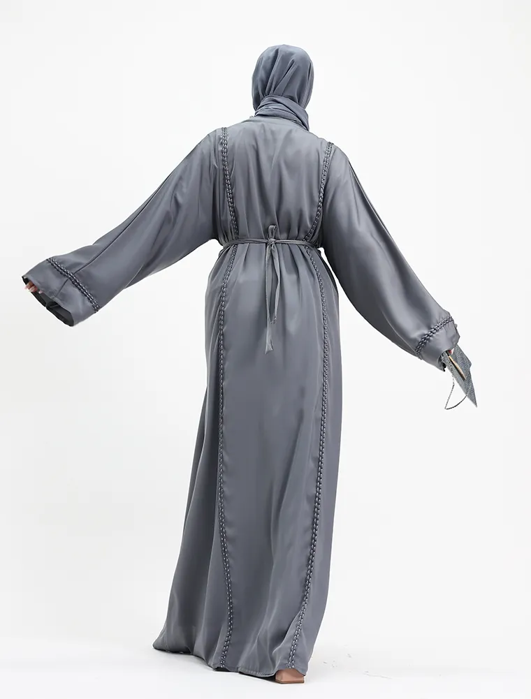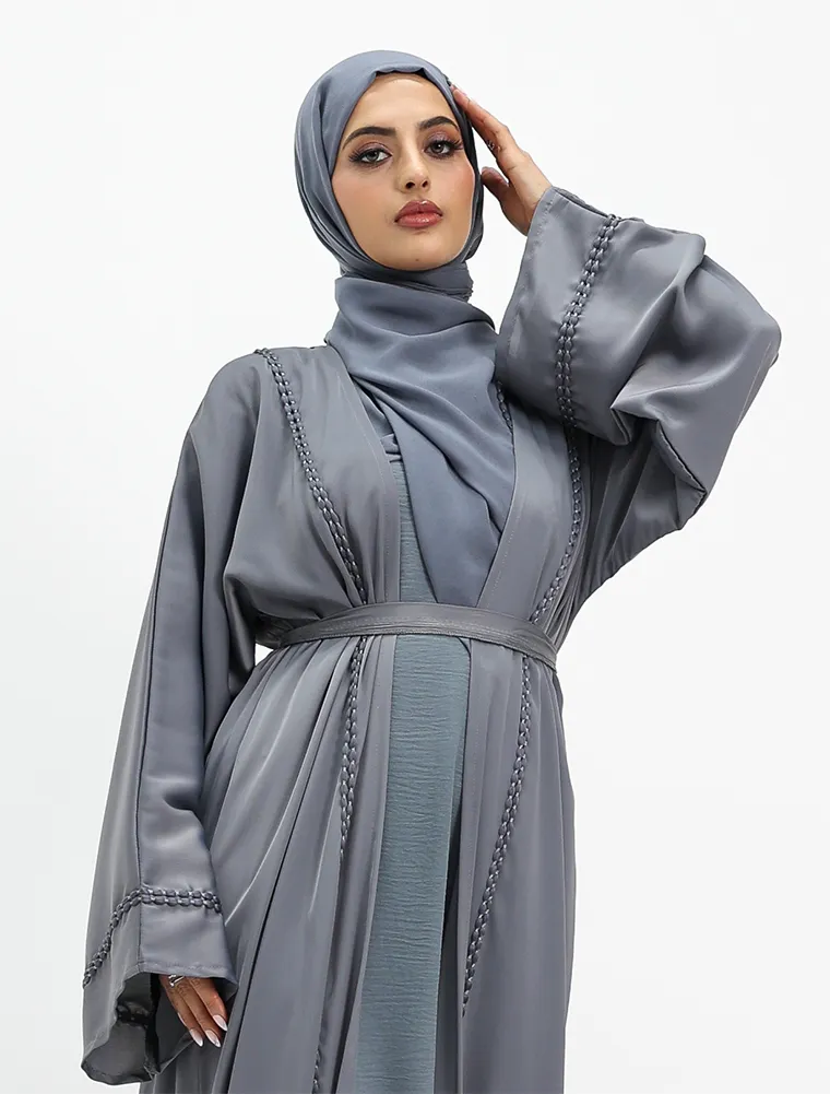 Crafted from luxurious, lustrous satin, the Kyra two-piece abaya set drapes beautifully to create an effortlessly elegant and modest silhouette. Designed for both comfort and sophistication, the flowing outer abaya is finished with a refined rope bubble trim along the front, cuffs, and back, adding subtle texture and a contemporary yet timeless touch to the design.