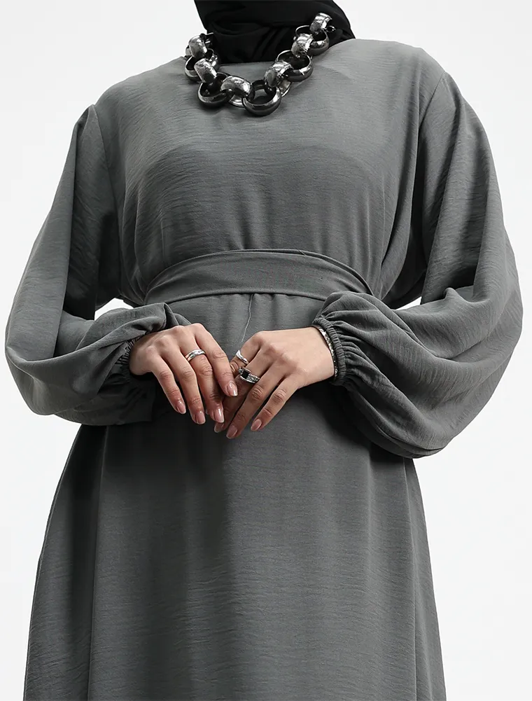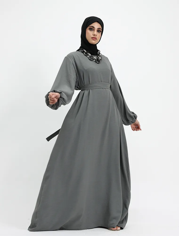 Another basic abaya which you can't go wrong with, although simple it will meet your expectations for your everyday comfort. This dress features an A-line cut flared bottom with pockets on both sides for your essentials, elasticated cuffs to give a slight puff look. A separate belt is included to give a more structured look or you can just opt for the more casual look without it.