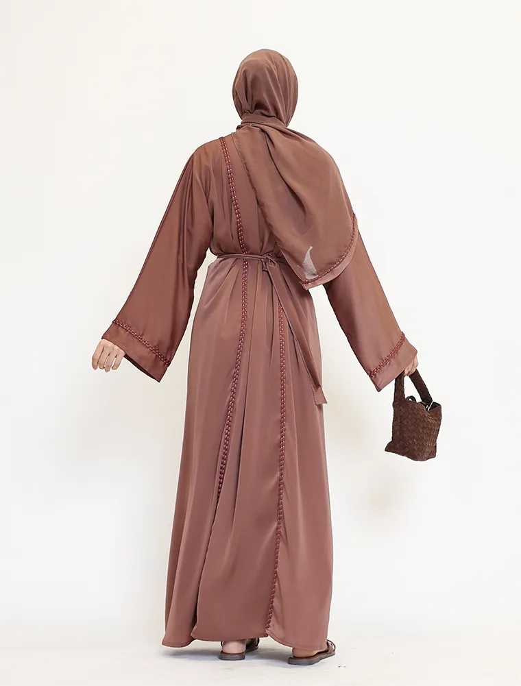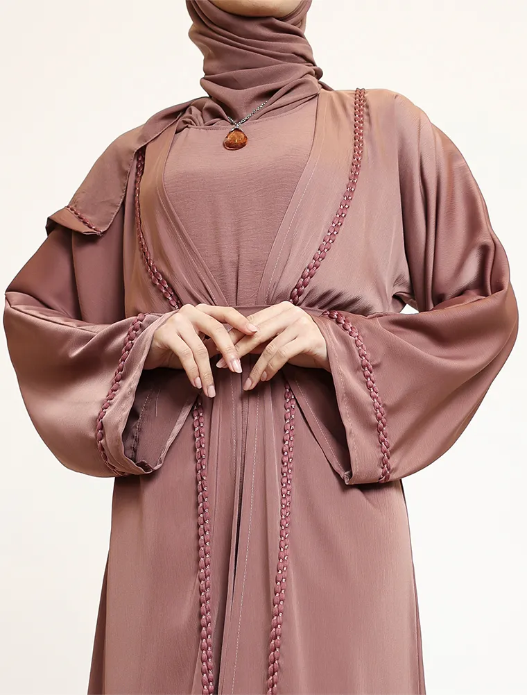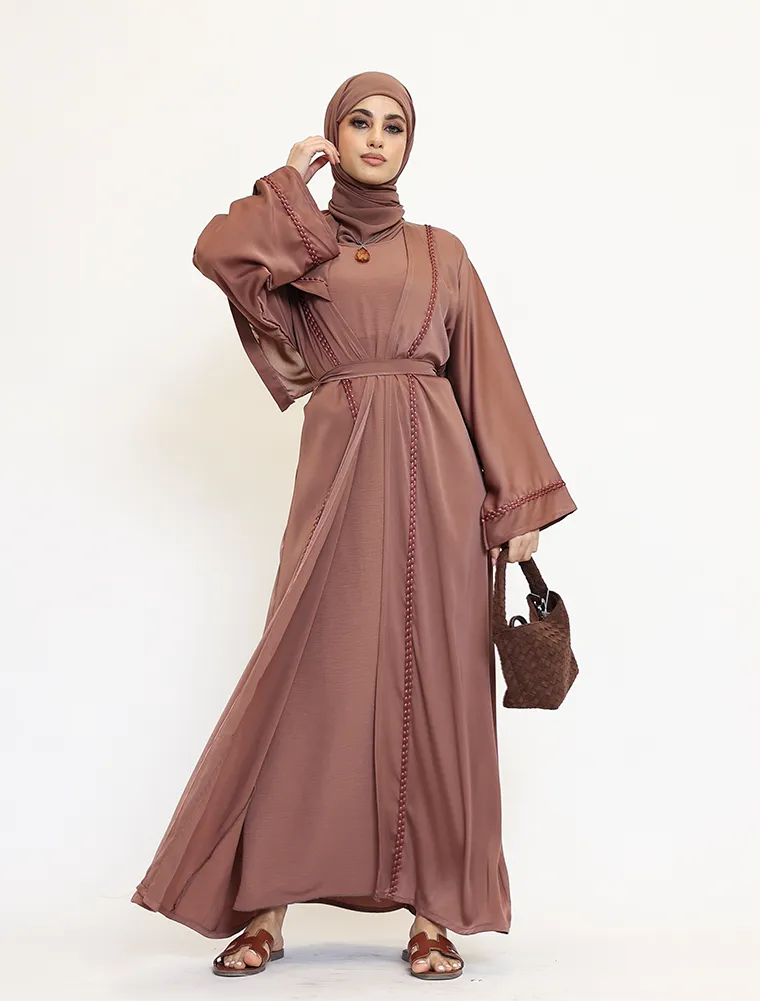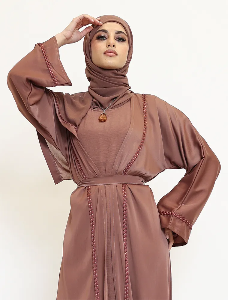 Crafted from luxurious, lustrous satin, the Kyra two-piece abaya set drapes beautifully to create an effortlessly elegant and modest silhouette. Designed for both comfort and sophistication, the flowing outer abaya is finished with a refined rope bubble trim along the front, cuffs, and back, adding subtle texture and a contemporary yet timeless touch to the design.
