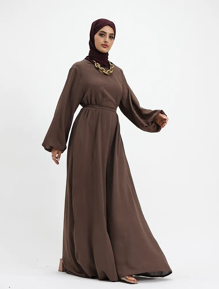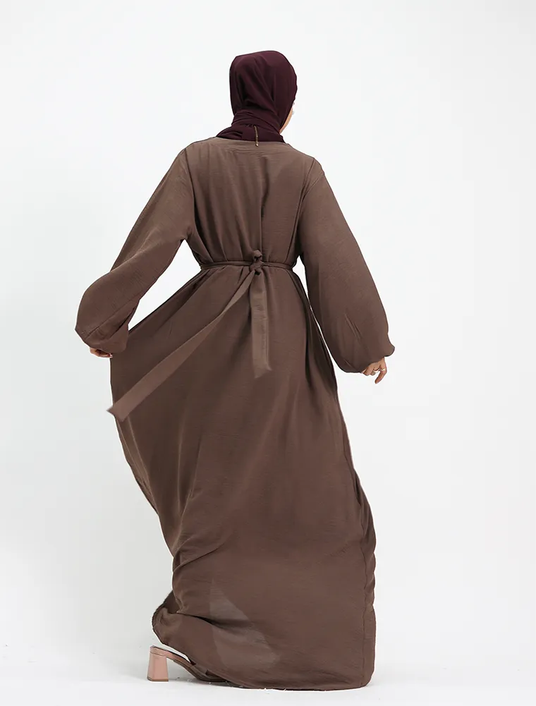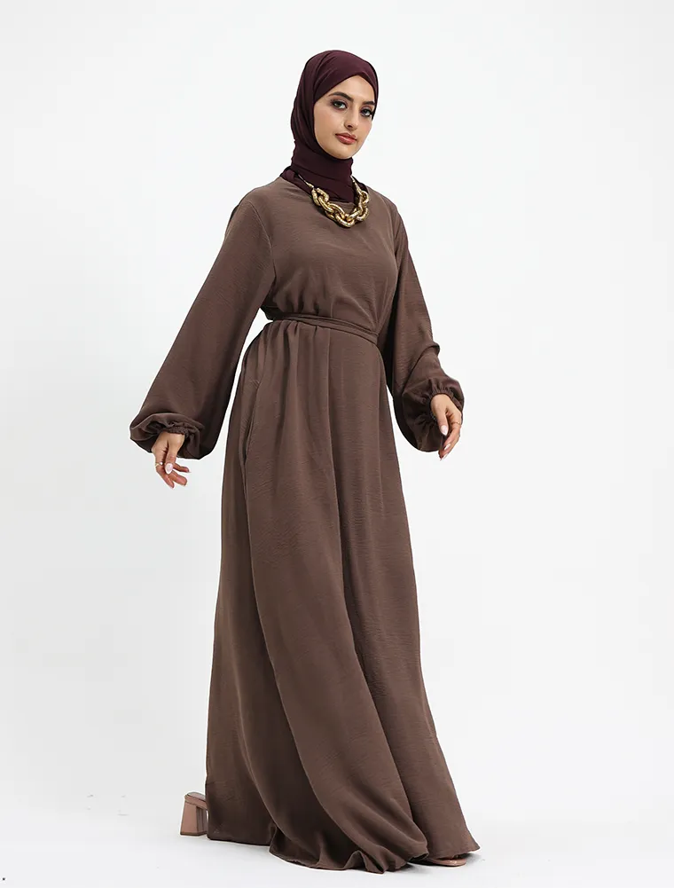 Another basic abaya which you can't go wrong with, although simple it will meet your expectations for your everyday comfort. This dress features an A-line cut flared bottom with pockets on both sides for your essentials, elasticated cuffs to give a slight puff look. A separate belt is included to give a more structured look or you can just opt for the more casual look without it.