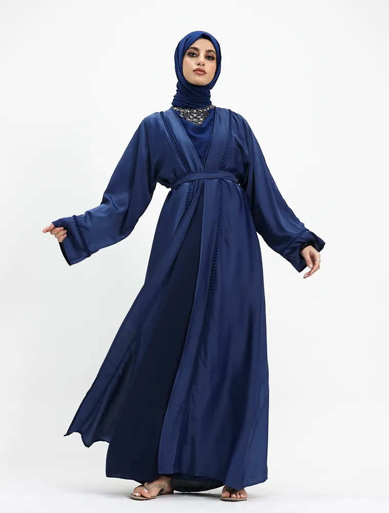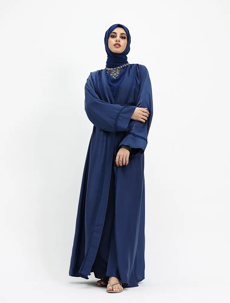Crafted from luxurious, lustrous satin, the Kyra two-piece abaya set drapes beautifully to create an effortlessly elegant and modest silhouette. Designed for both comfort and sophistication, the flowing outer abaya is finished with a refined rope bubble trim along the front, cuffs, and back, adding subtle texture and a contemporary yet timeless touch to the design.