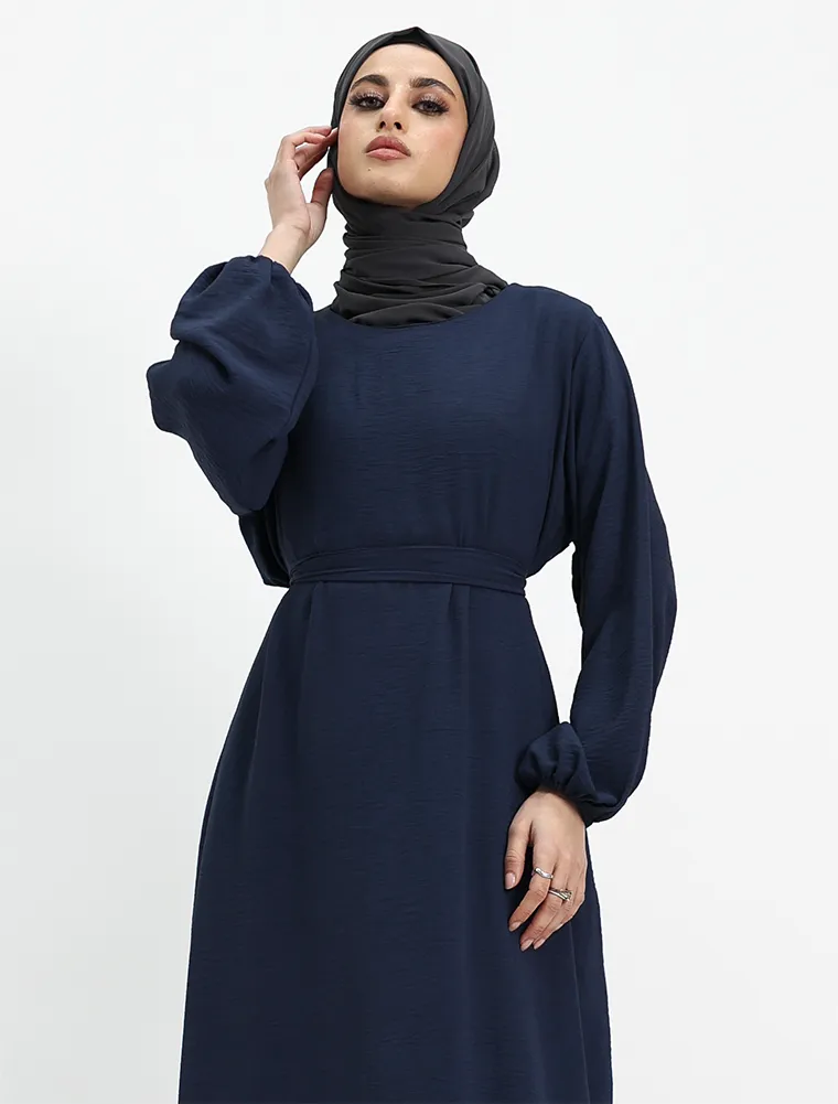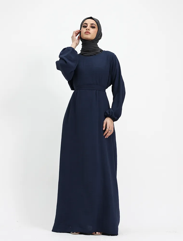 Another basic abaya which you can't go wrong with, although simple it will meet your expectations for your everyday comfort. This dress features an A-line cut flared bottom with pockets on both sides for your essentials, elasticated cuffs to give a slight puff look. A separate belt is included to give a more structured look or you can just opt for the more casual look without it.