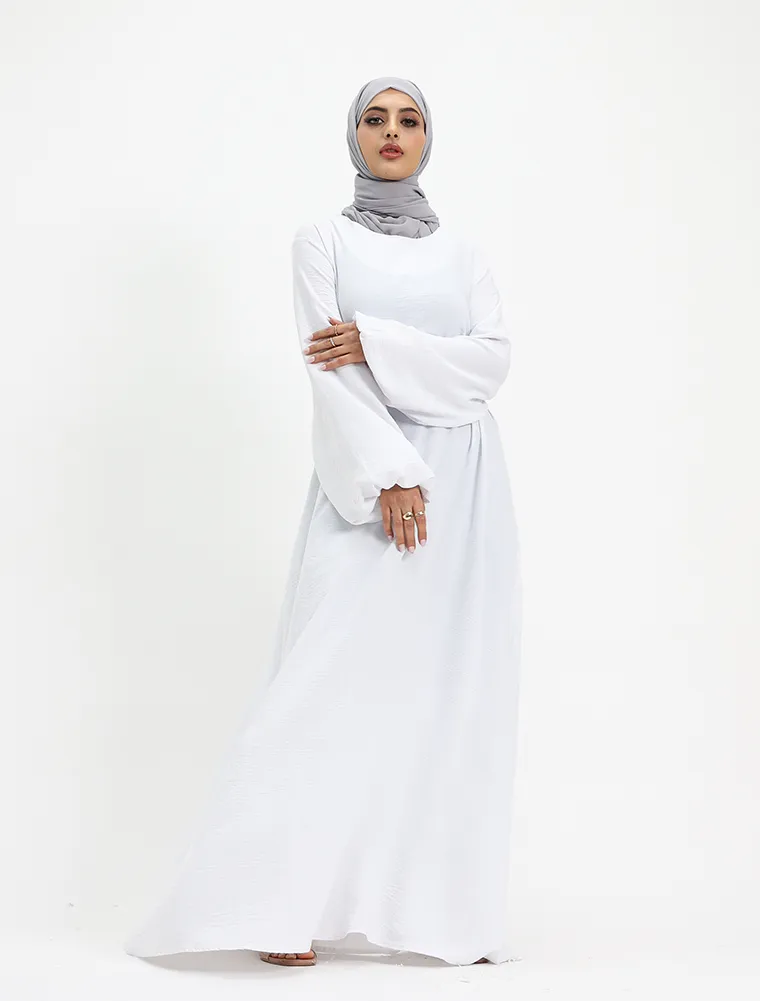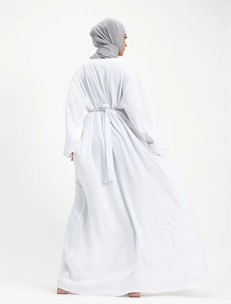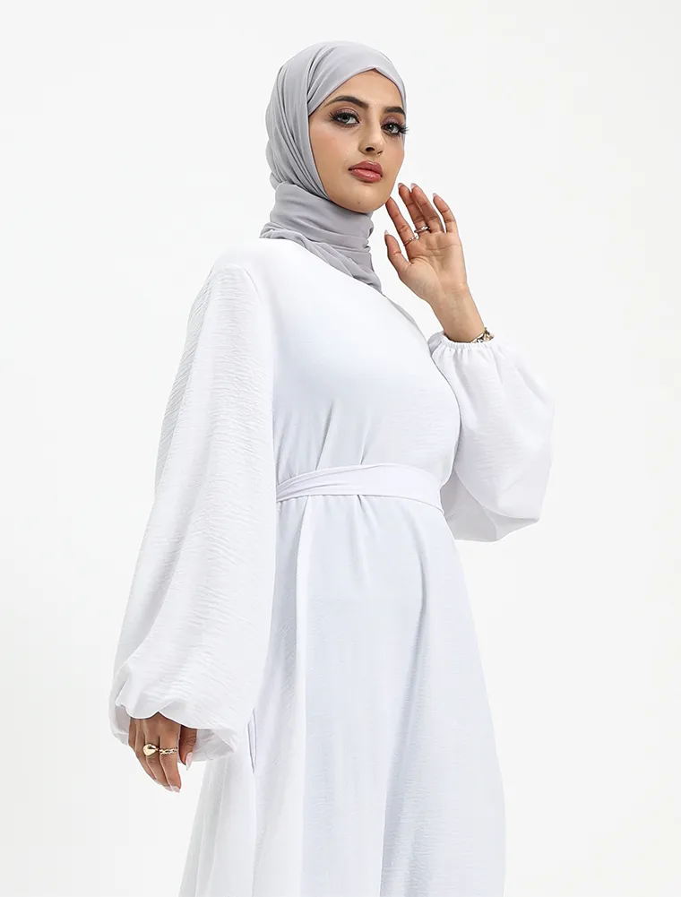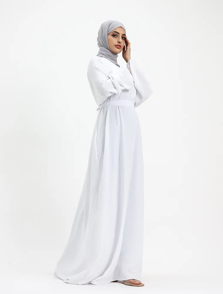 Another basic abaya which you can't go wrong with, although simple it will meet your expectations for your everyday comfort. This dress features an A-line cut flared bottom with pockets on both sides for your essentials, elasticated cuffs to give a slight puff look. A separate belt is included to give a more structured look or you can just opt for the more casual look without it.