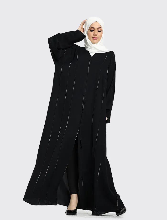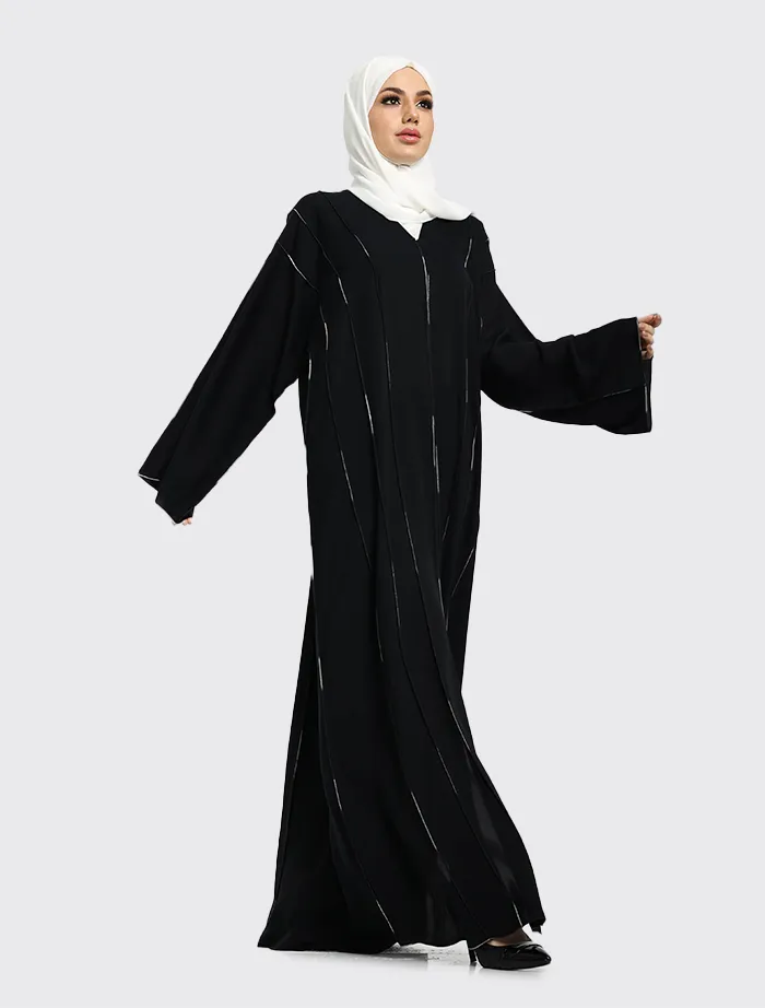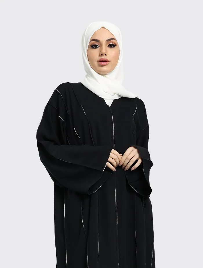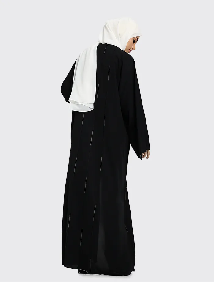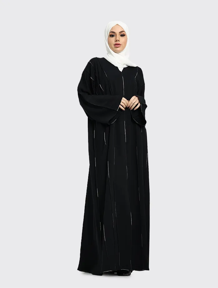 This abaya can be the trendiest piece in your wardrobe this Season. This open abaya has two tone contrast embroidery. Hidden press buttons running down the front opening.