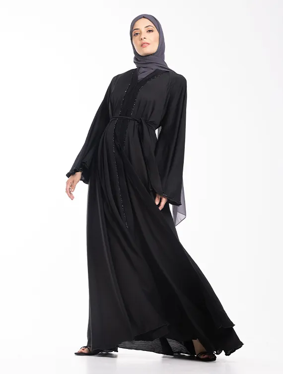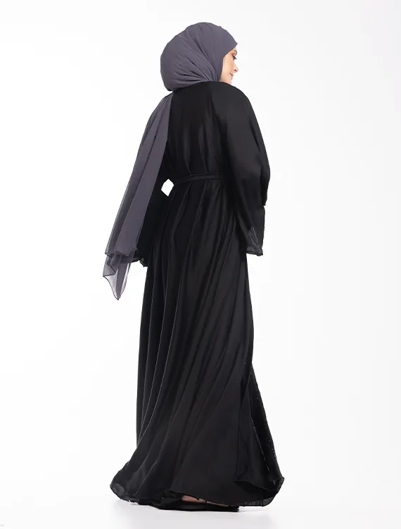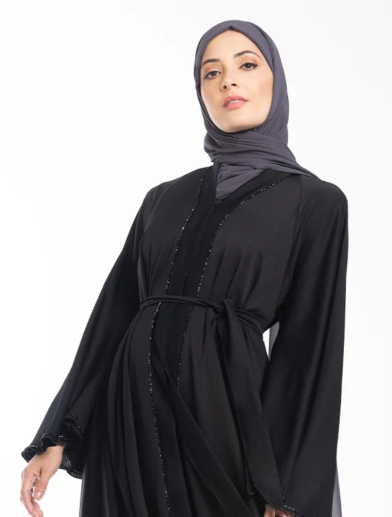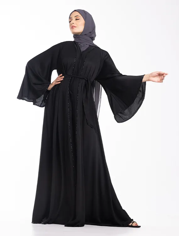 The crinkle fabric beautifully enhances the full-flare, umbrella-style silhouette of this abaya. Designed without side seams, its bias cut ensures a flawless drape and flattering fit. Inspired by our bestselling Makeba abaya, this upgraded version features intricate hand beadwork along the cuff edges and front panels. Additional details include flared sleeves, a V-neckline, and concealed press buttons running down the front. Finished with a matching belt for a more defined and structured look.