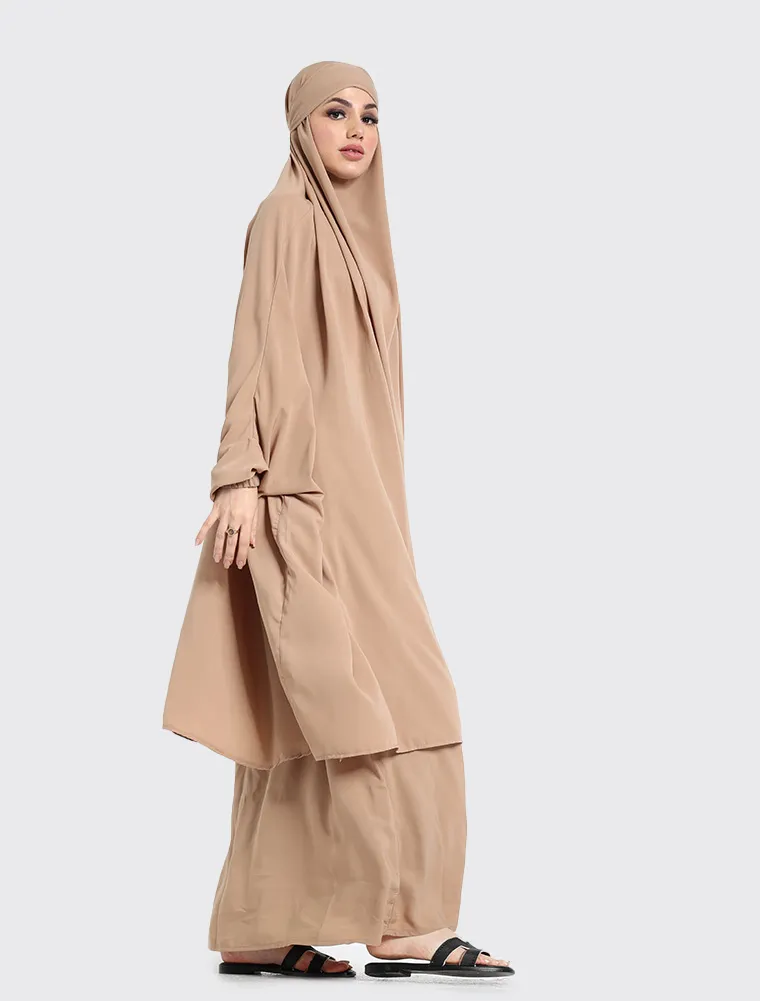This half-jilbab set is thoughtfully designed with a chin-covering style and a tie-back headband for a secure and comfortable fit. The elasticated cuffs make performing wudhu easy and convenient, while the slightly flared skirt features an elasticated waistband to ensure a flexible fit for sizes 8 to 16. Sold as a free-size set, this khimar offers both modesty and ease for everyday wear.