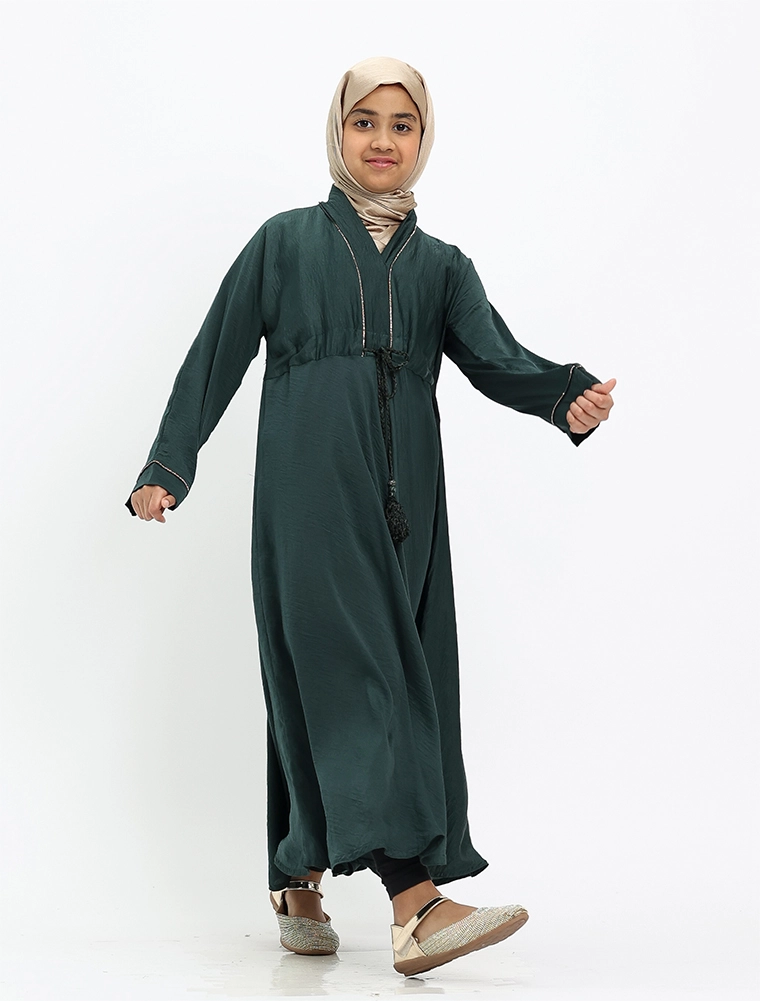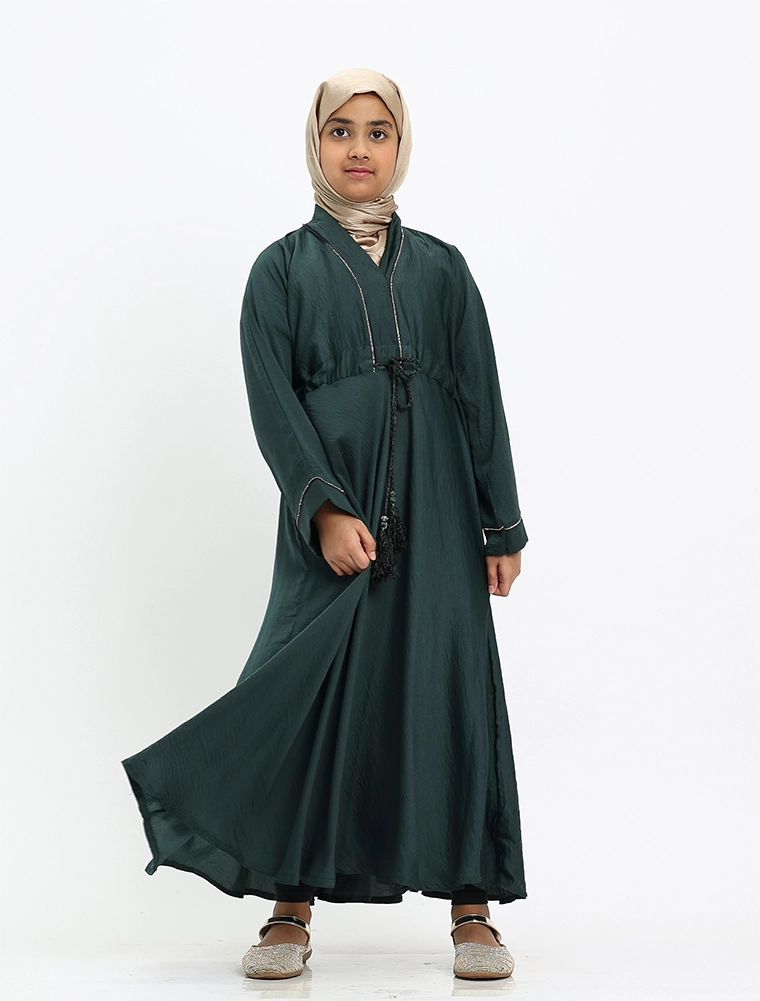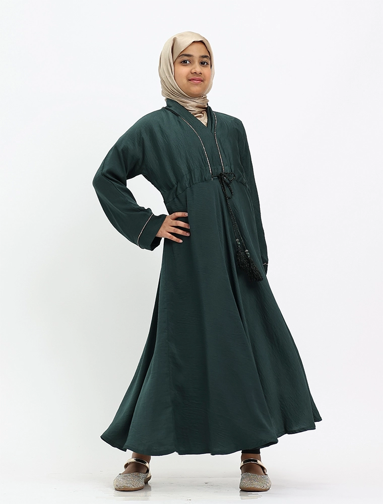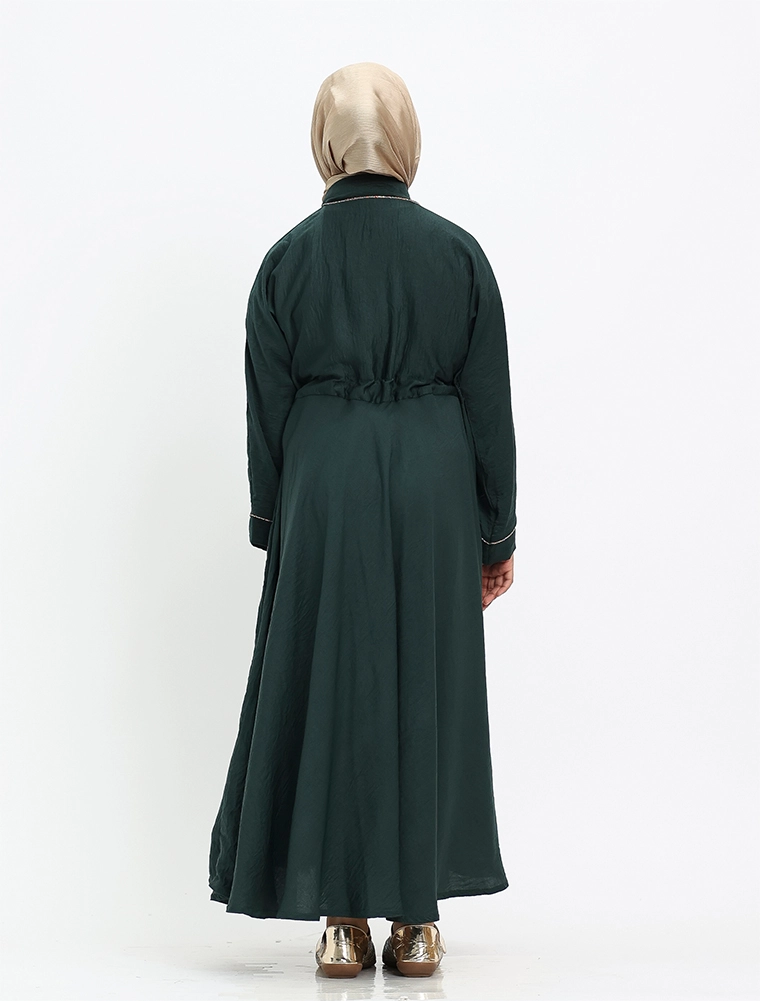 The design showcases a V-neckline accented with a gold diamante trim on the upper bodice and cuffs. A drawcord at the waist allows for a more tailored fit, while the silky textured fabric enhances the elegant flow of the full-flare umbrella-cut bottom.