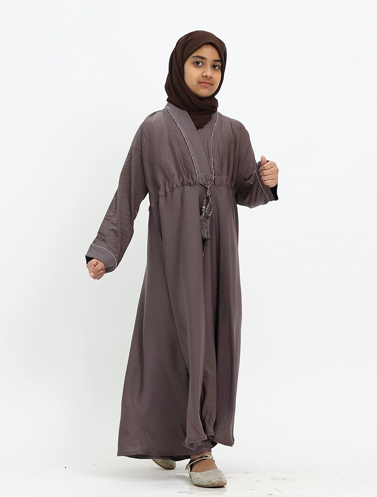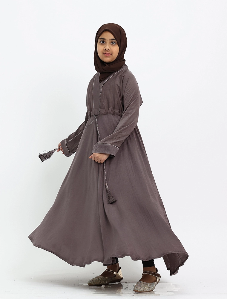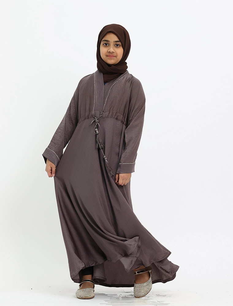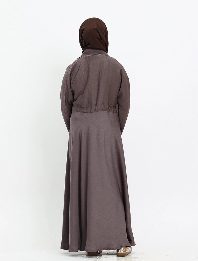 The design showcases a V-neckline accented with a gold diamante trim on the upper bodice and cuffs. A drawcord at the waist allows for a more tailored fit, while the silky textured fabric enhances the elegant flow of the full-flare umbrella-cut bottom.