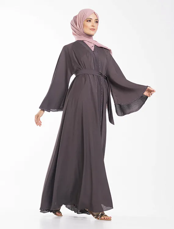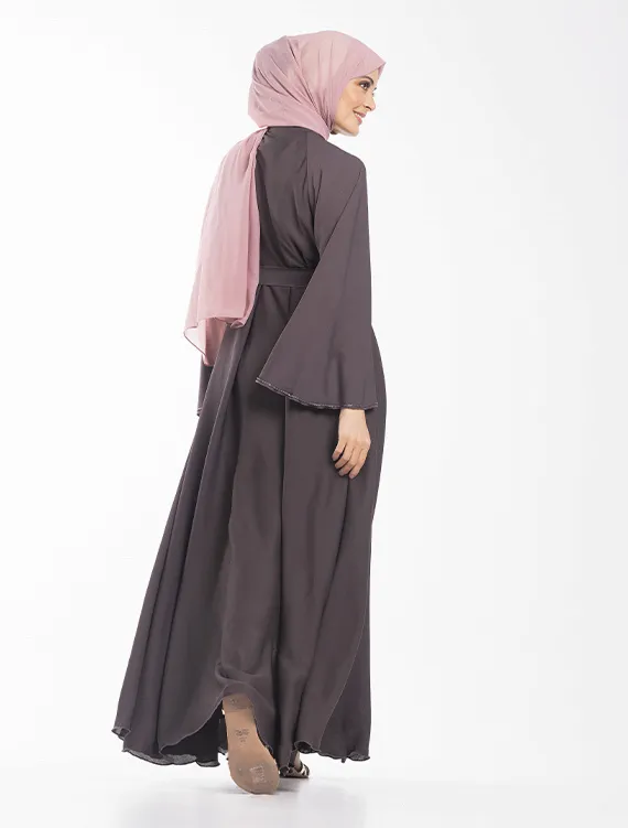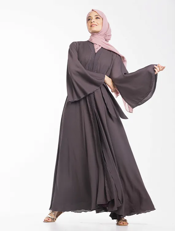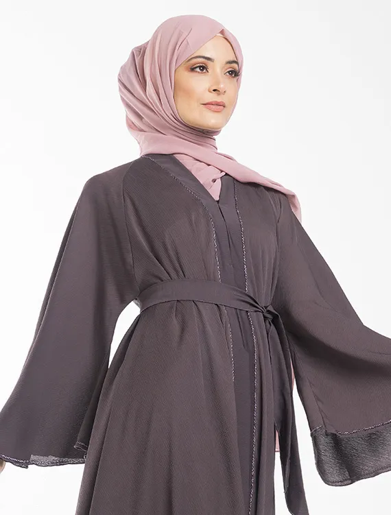 The crinkle fabric beautifully enhances the full-flare, umbrella-style silhouette of this abaya. Designed without side seams, its bias cut ensures a flawless drape and flattering fit. Inspired by our bestselling Makeba abaya, this upgraded version features intricate hand beadwork along the cuff edges and front panels. Additional details include flared sleeves, a V-neckline, and concealed press buttons running down the front. Finished with a matching belt for a more defined and structured look.