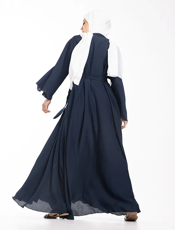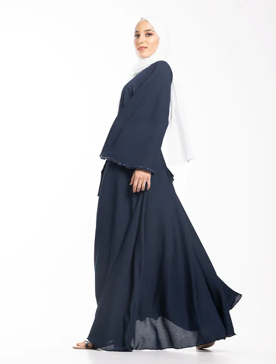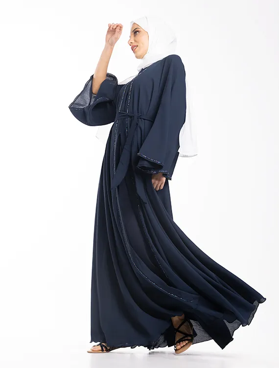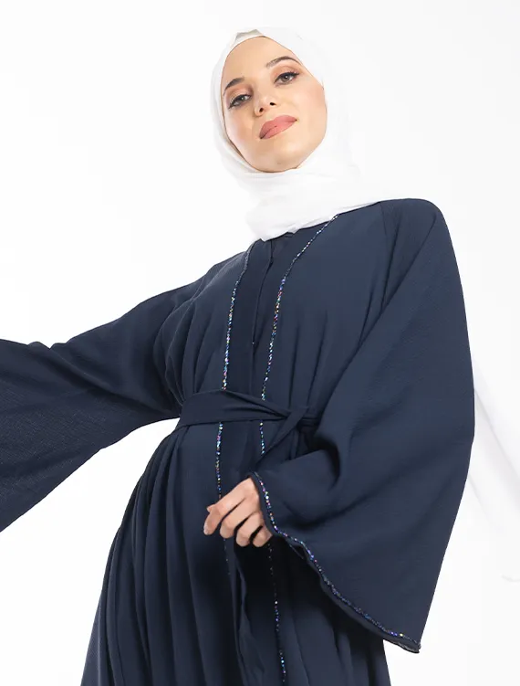The crinkle fabric beautifully enhances the full-flare, umbrella-style silhouette of this abaya. Designed without side seams, its bias cut ensures a flawless drape and flattering fit. Inspired by our bestselling Makeba abaya, this upgraded version features intricate hand beadwork along the cuff edges and front panels. Additional details include flared sleeves, a V-neckline, and concealed press buttons running down the front. Finished with a matching belt for a more defined and structured look.