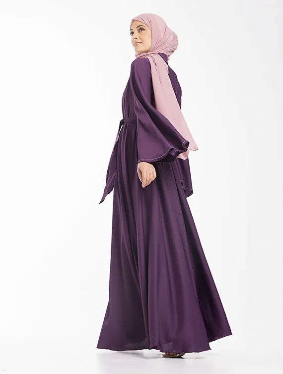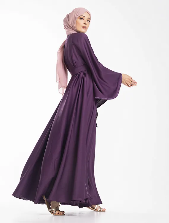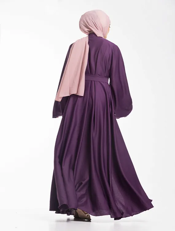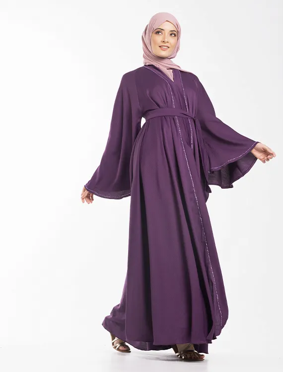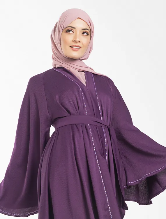 The crinkle fabric beautifully enhances the full-flare, umbrella-style silhouette of this abaya. Designed without side seams, its bias cut ensures a flawless drape and flattering fit. Inspired by our bestselling Makeba abaya, this upgraded version features intricate hand beadwork along the cuff edges and front panels. Additional details include flared sleeves, a V-neckline, and concealed press buttons running down the front. Finished with a matching belt for a more defined and structured look.