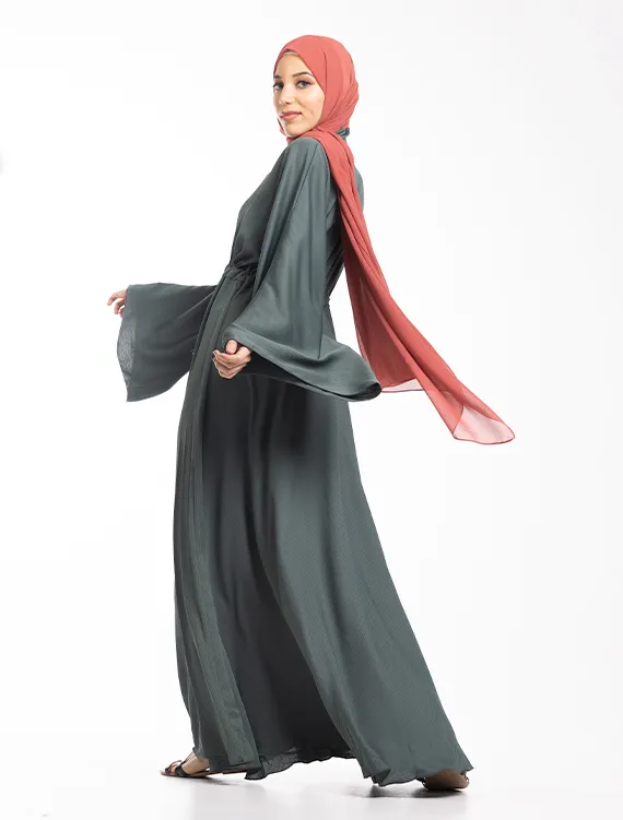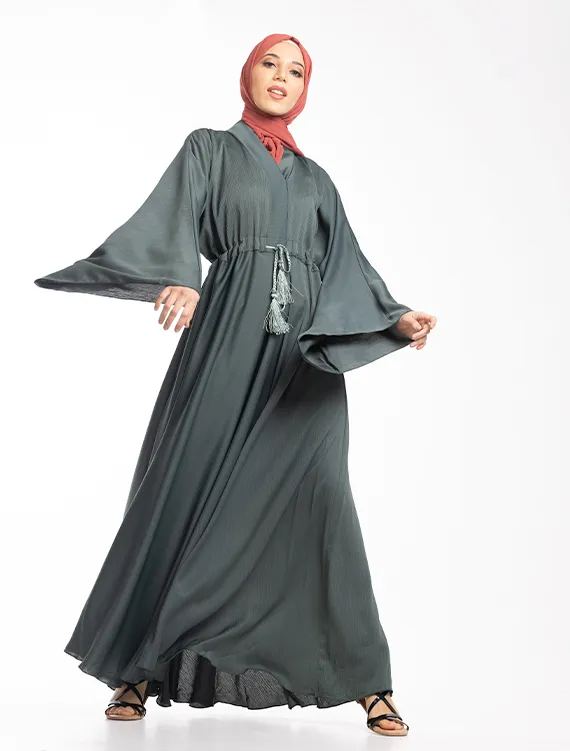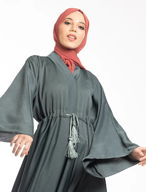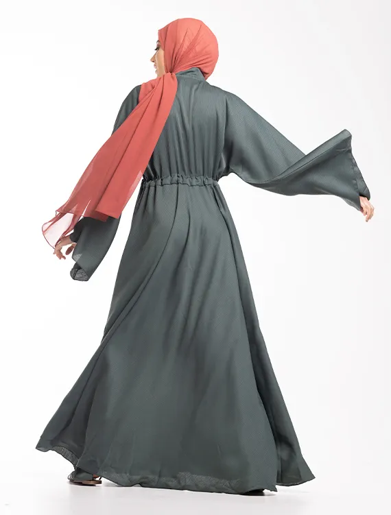 The Nida crinkle textured fabric perfectly complements the full-flare umbrella silhouette. Additional details include flared sleeves, a V-neckline, and a drawstring at the waist for a more tailored, structured fit.