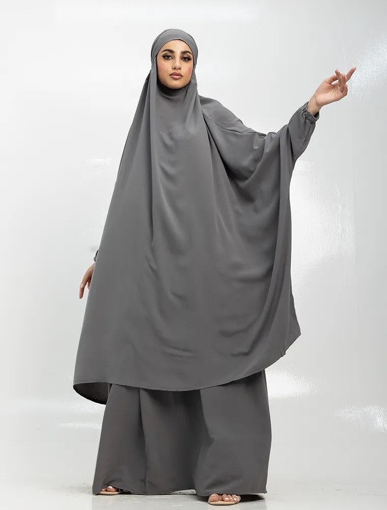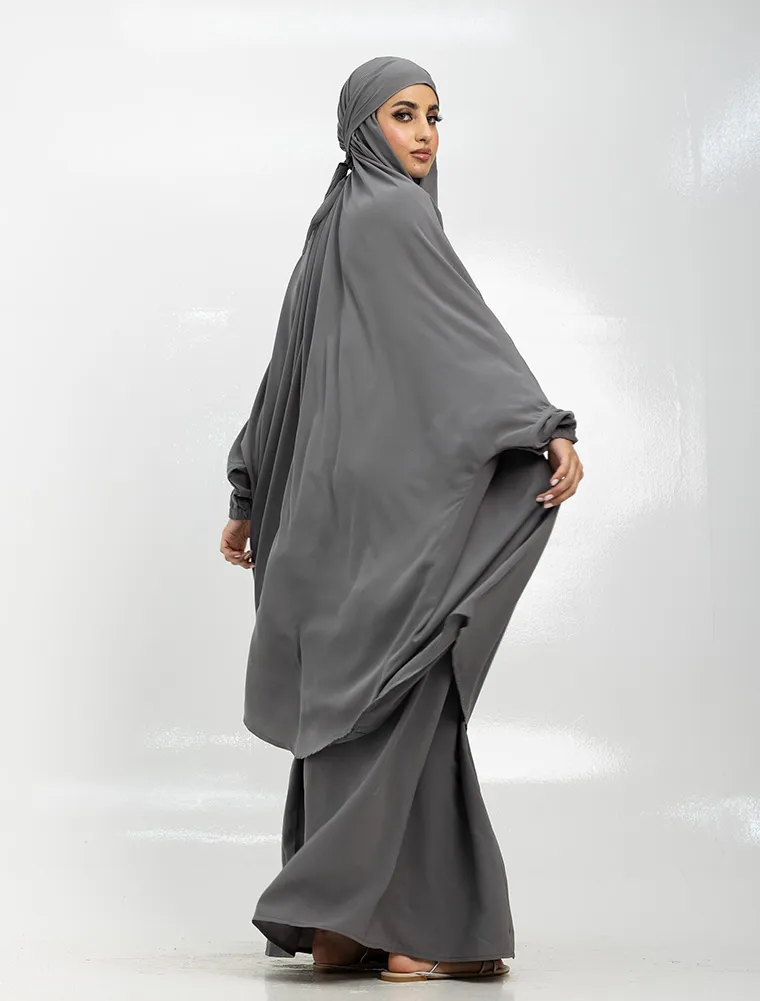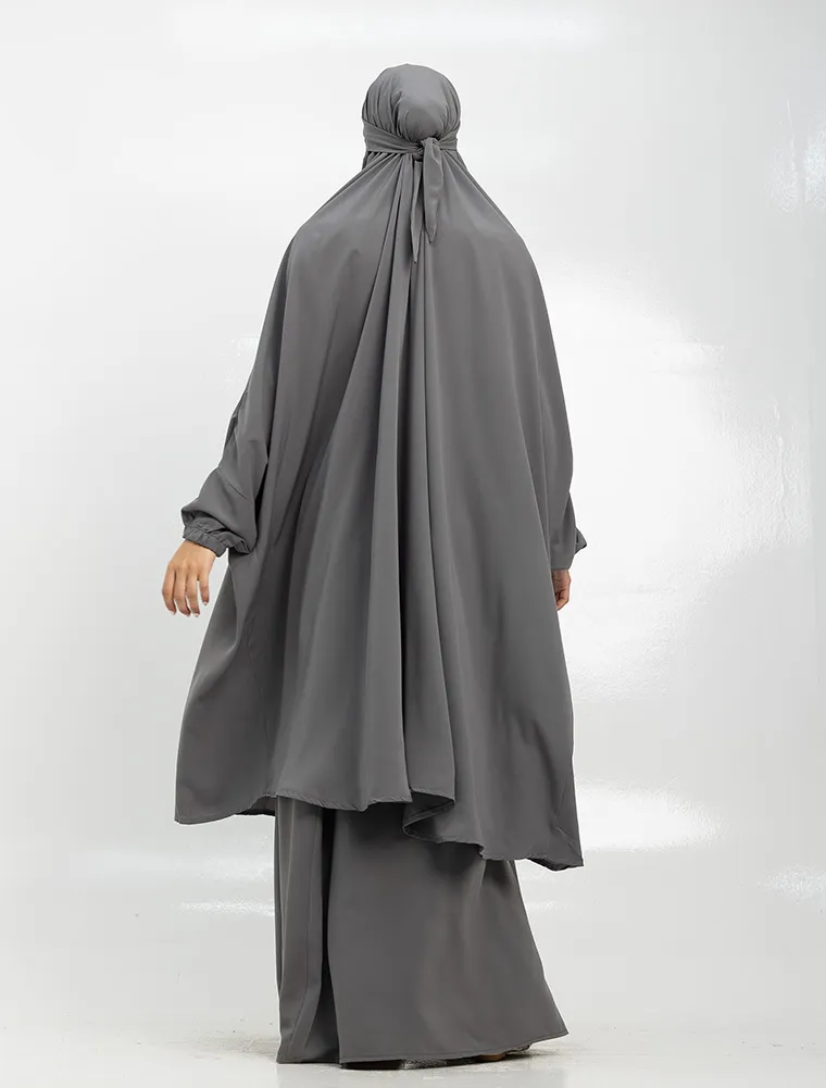 This half-jilbab set is thoughtfully designed with a chin-covering style and a tie-back headband for a secure and comfortable fit. The elasticated cuffs make performing wudhu easy and convenient, while the slightly flared skirt features an elasticated waistband to ensure a flexible fit for sizes 8 to 16. Sold as a free-size set, this khimar offers both modesty and ease for everyday wear.