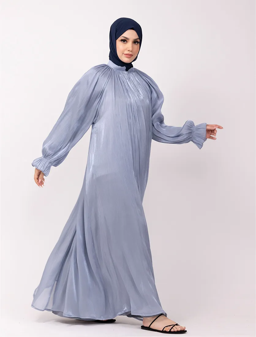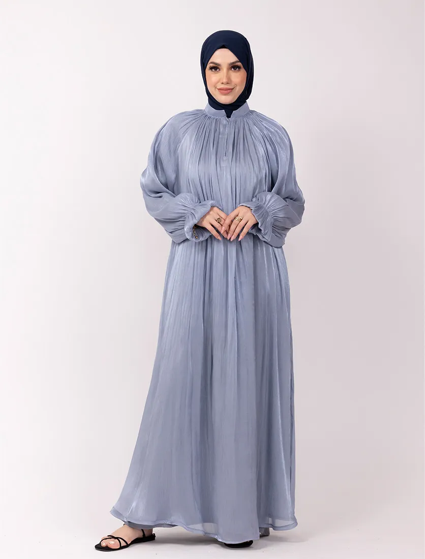 An organza umbrella cut abaya with a separate lining garment typically features an elegant and flowing silhouette due to the umbrella cut. Features a collar, adding a structured element to the abaya. Has a zip opening at the top, making it easy to wear and remove. Balloon sleeves with elasticated cuffs, giving a puffy and stylish look.