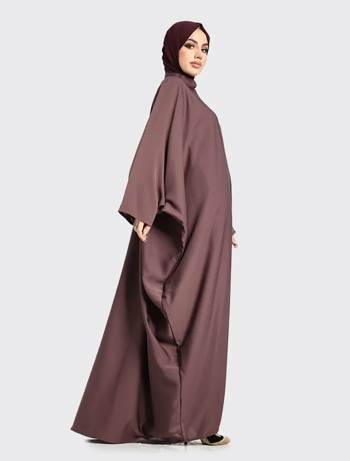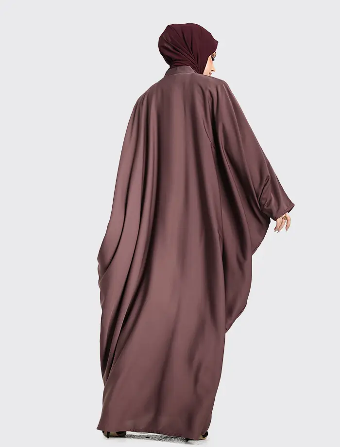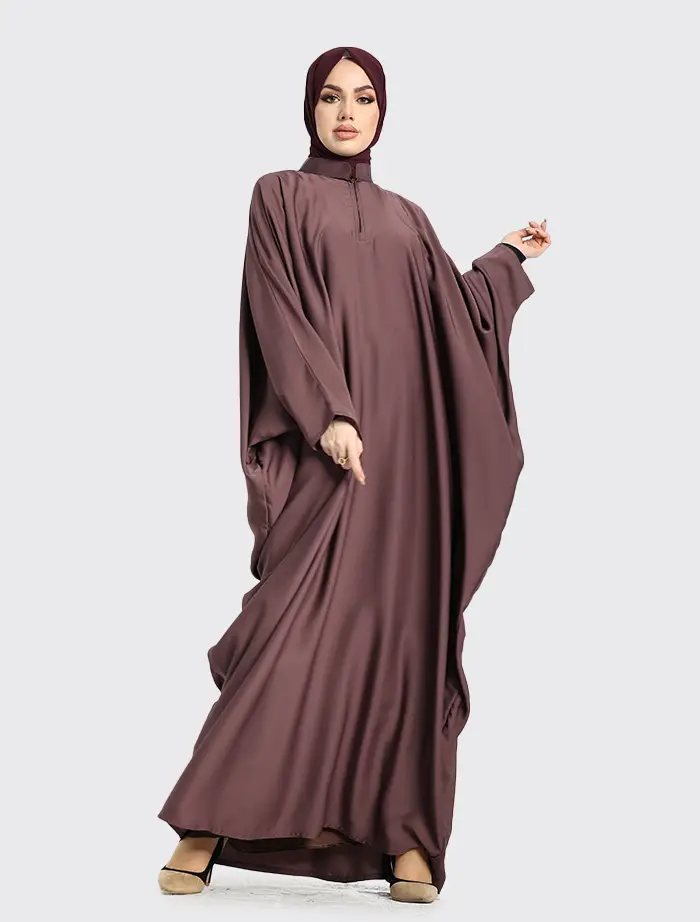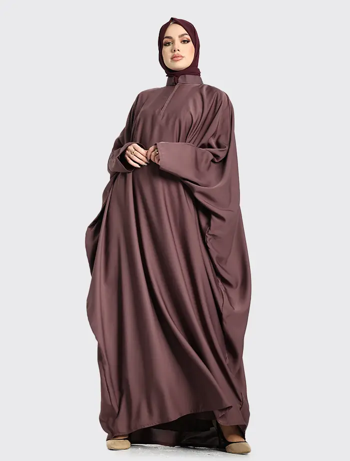 This abaya, though simple in design, is crafted to provide effortless everyday comfort. It features a relaxed batwing silhouette with armholes that blend seamlessly into the side seams. The look is completed with a neat mandarin collar and an 8-inch (20 cm) zip opening at the neckline.