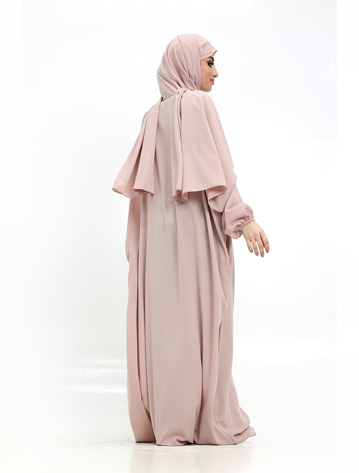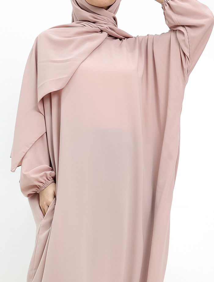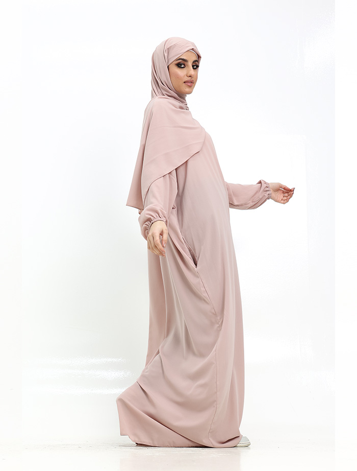 sleeves makes wudhu comfortable and the pockets make it perfect to carry your essentials. The abaya is slightly flared with a batwing