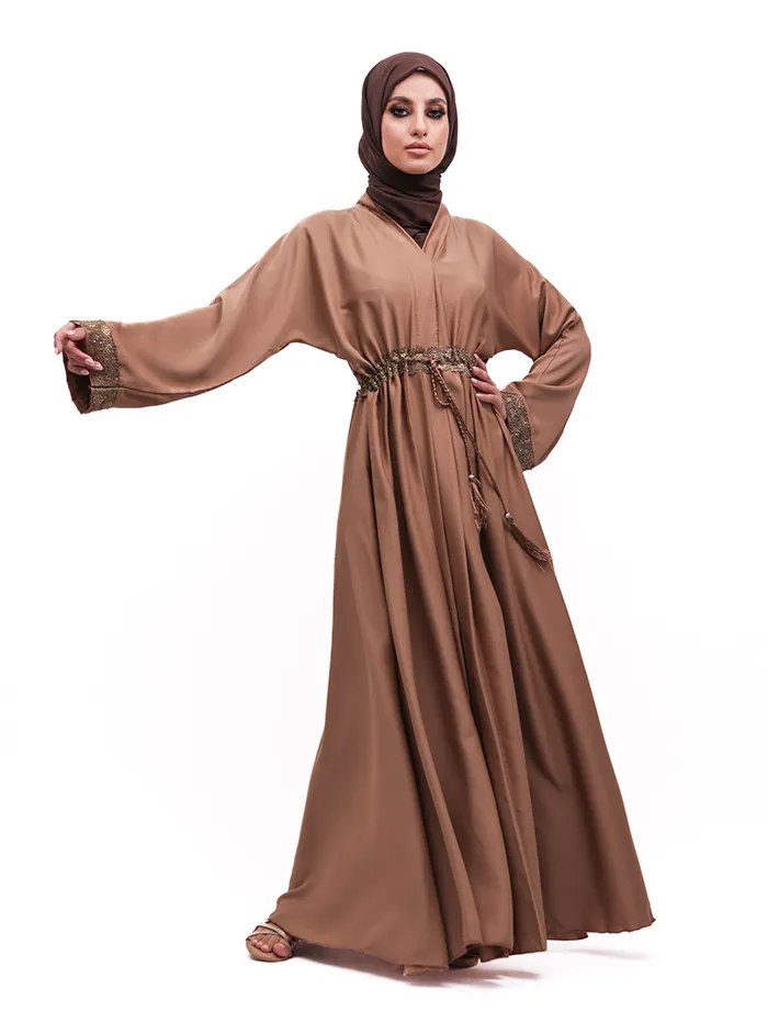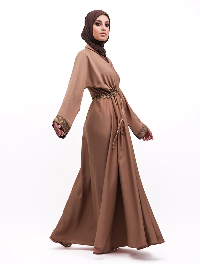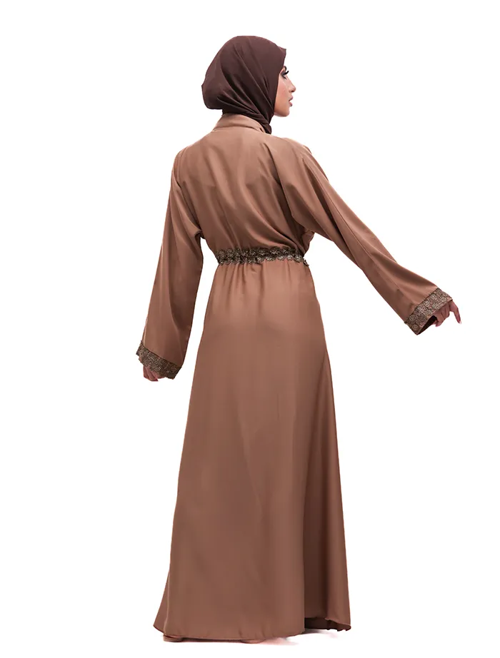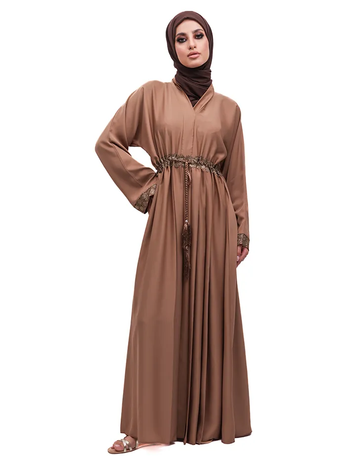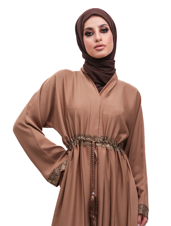 The garment features a flattering V-neckline and a draw cord at the waistline, allowing for a more structured and adjustable fit. Lace trim adorns both the waist and cuffs, adding a delicate, feminine touch. The look is further enhanced by the addition of sparkling diamantes, offering a hint of glamour.