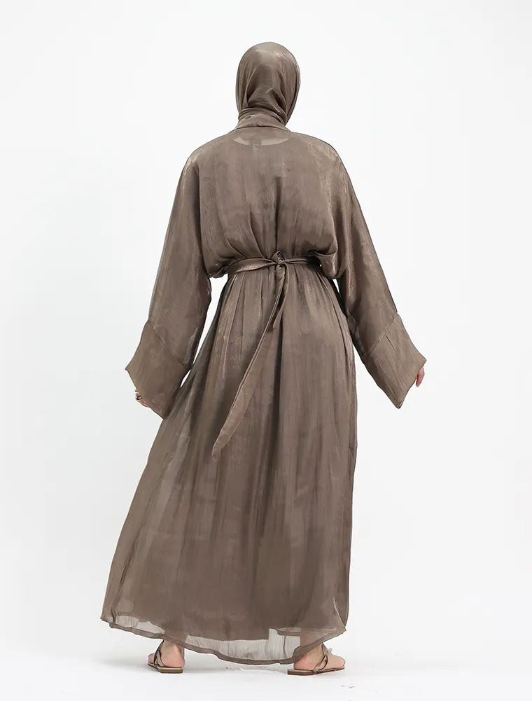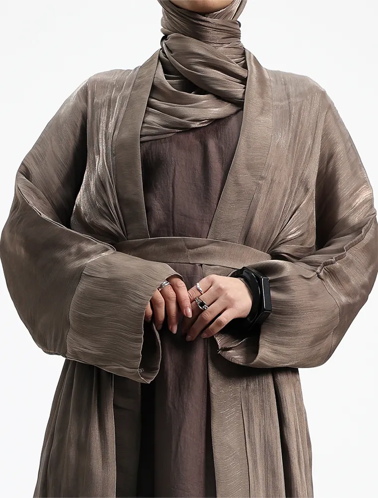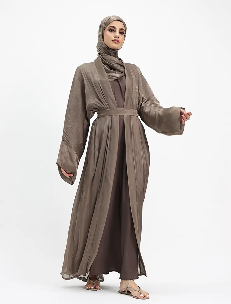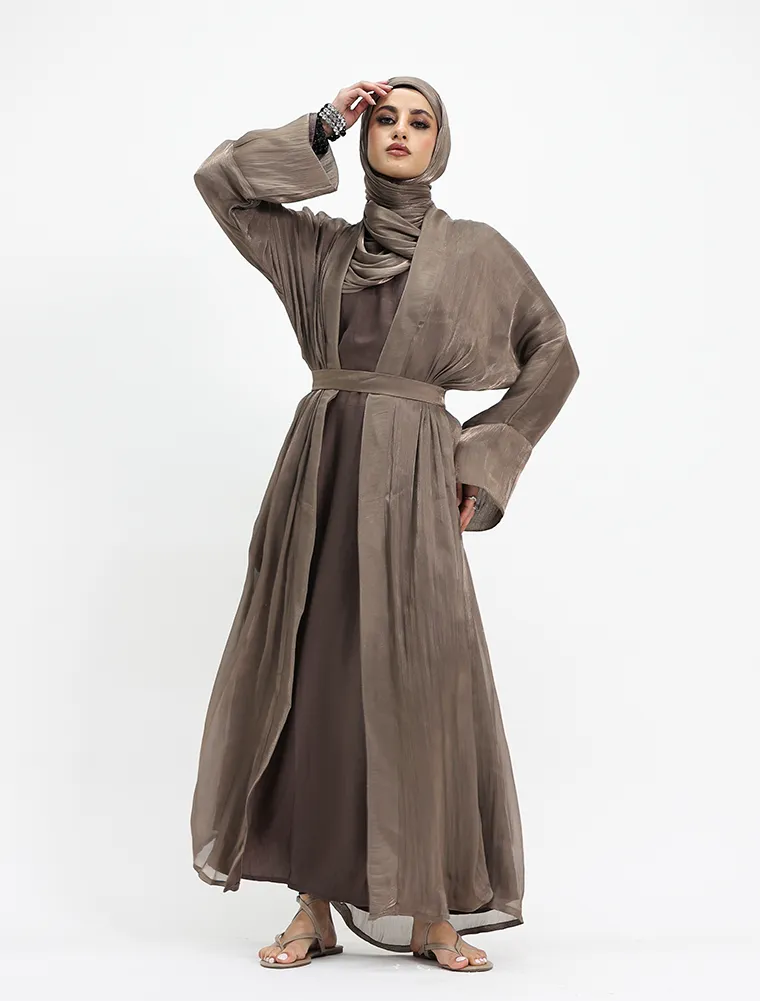 This elegant 2-piece set embodies effortless minimalism while offering all-day comfort. It features a full-sleeve slip dress, beautifully layered beneath a lightweight organza kimono for a refined finish. Designed with practicality in mind, the slip includes functional side pockets on both sides for everyday essentials. A separate matching belt is included, allowing you to style the set cinched for a structured silhouette or worn loose for a relaxed, casual look—perfect for versatile, everyday wear.