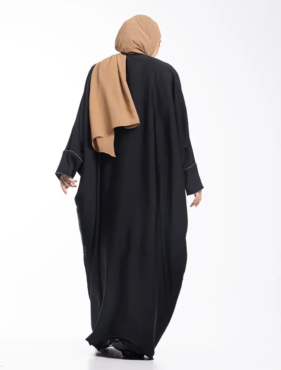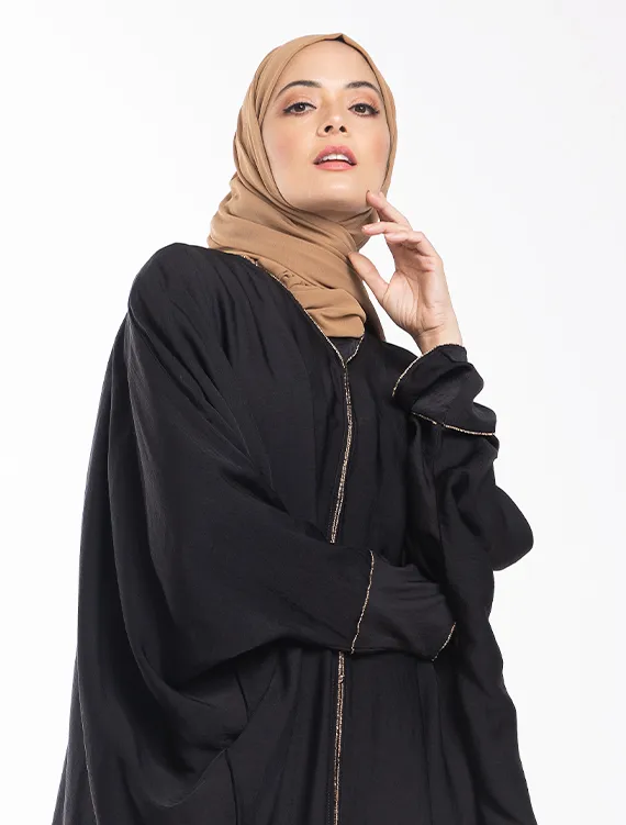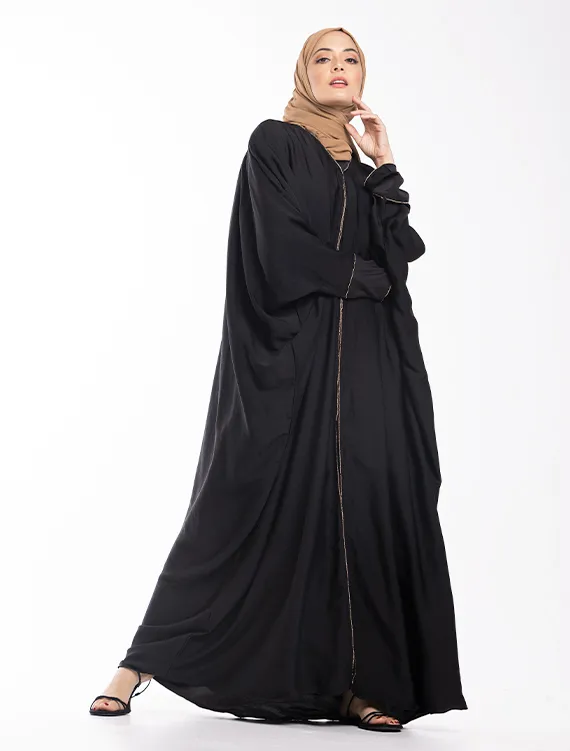 Featuring a V neckline and front opening with press button throughout, this abaya although simple will meet your expectations for your comfort on any occasion. This dress features a loose batwing cut fitting with armholes which ends at the side seam of the dress and gold trimming on the front facing and cuffs.