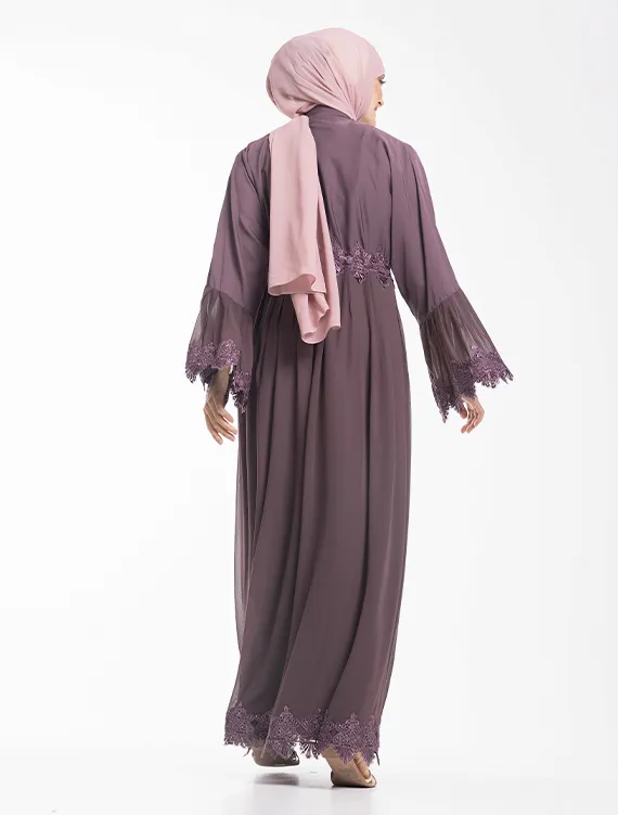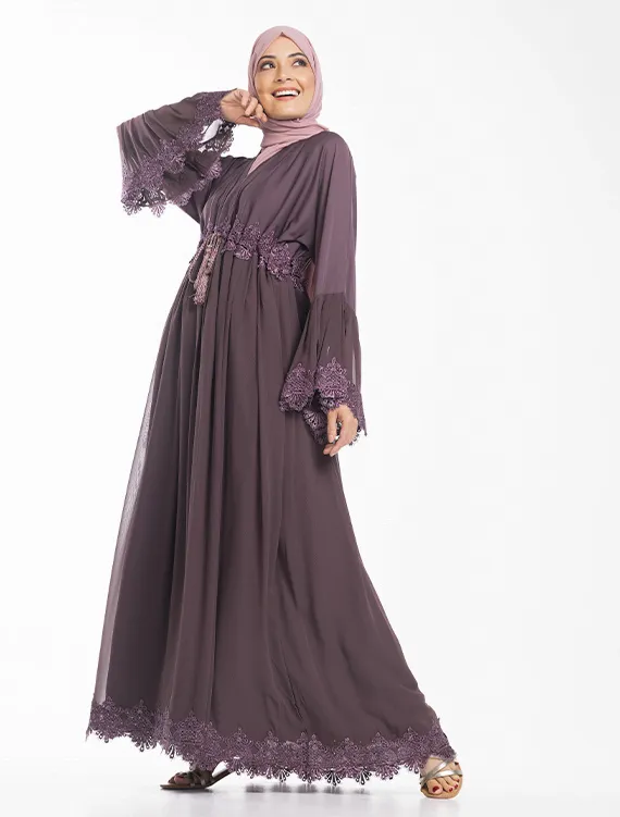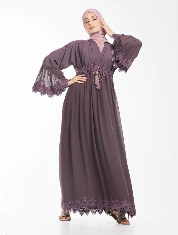 This style showcases a graceful V-neckline and an adjustable drawcord at the waist for a more defined silhouette. Crafted from premium chiffon, the design features double layering on the skirt and cuffs, delicately finished with lace trimming for an elegant, occasion-ready look.
