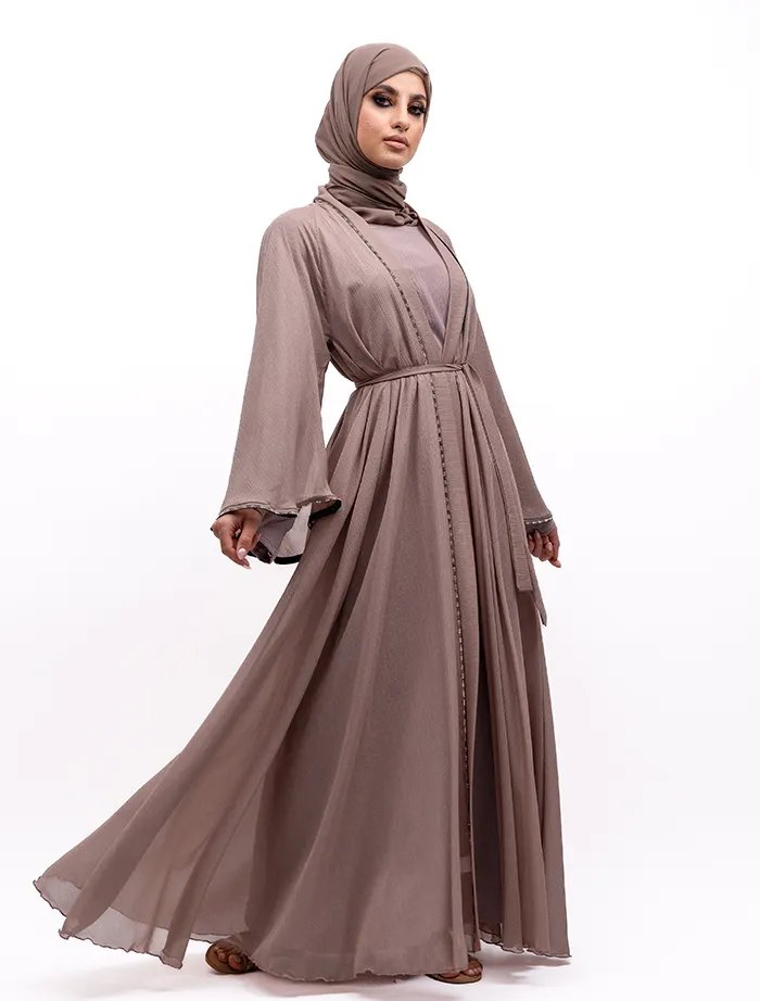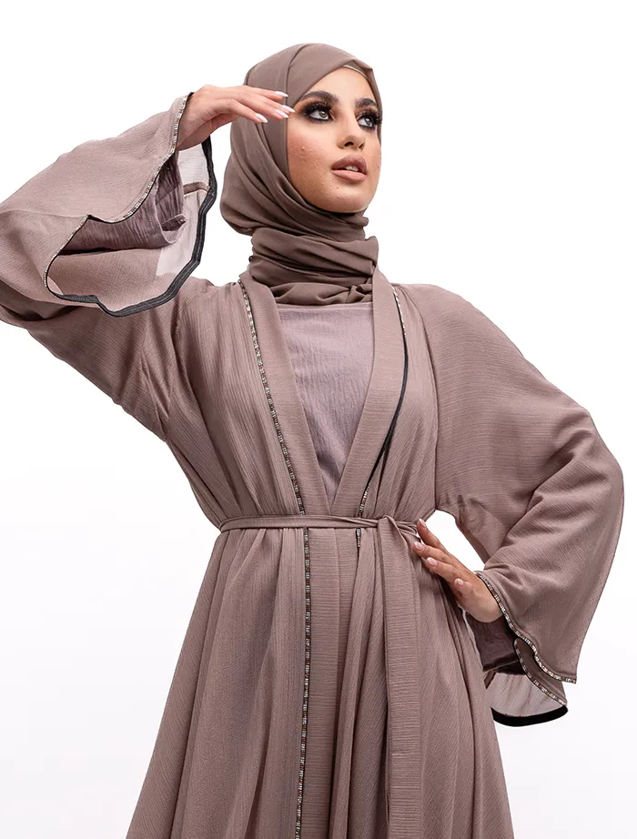 The organza fabric beautifully enhances the full-flare umbrella silhouette. The two-tone diamante trim, which runs along the front and edges of the flared cuffs, adds a striking touch to this standout piece. An Longsleeve inner slip is included, and a belt is attached for a secure fit.