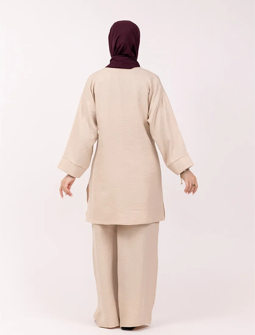 Refresh your everyday style with this effortlessly elegant co-ord set. Crafted from a subtly crinkled fabric, it offers a refined, contemporary look with a natural drape and lightweight comfort. The relaxed-fit top features wide sleeves and side slits for easy movement, while the matching wide-leg trousers bring a balanced silhouette that flatters all body types.