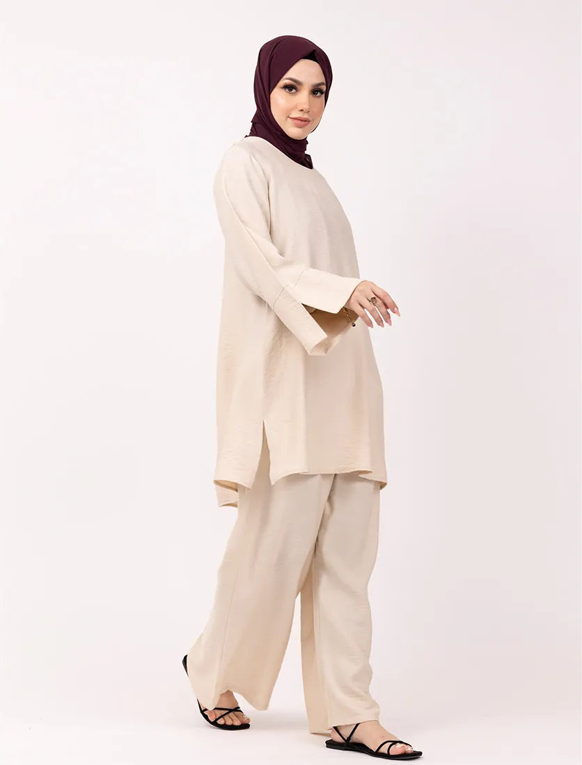 Step into effortless sophistication with this stylish two-piece co-ord set. Crafted from a soft textured fabric, the top features a relaxed fit with subtle split cuff and side slits, offering both comfort and contemporary flair. Paired with wide-leg trousers for a fluid, flattering silhouette, this set is ideal for casual elegance or elevated everyday wear. Wear as a complete look or mix and match for versatile styling.