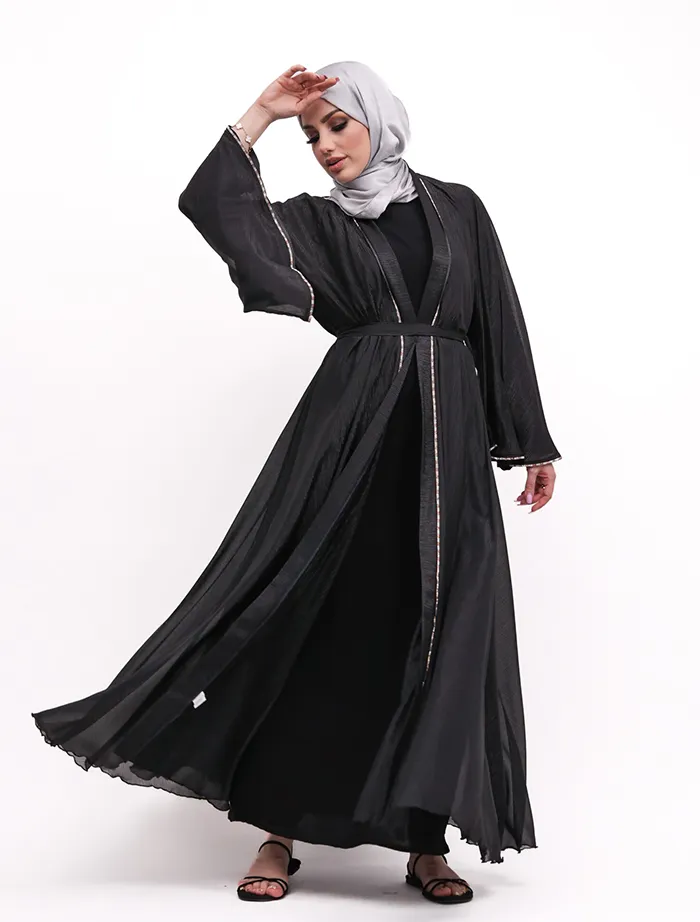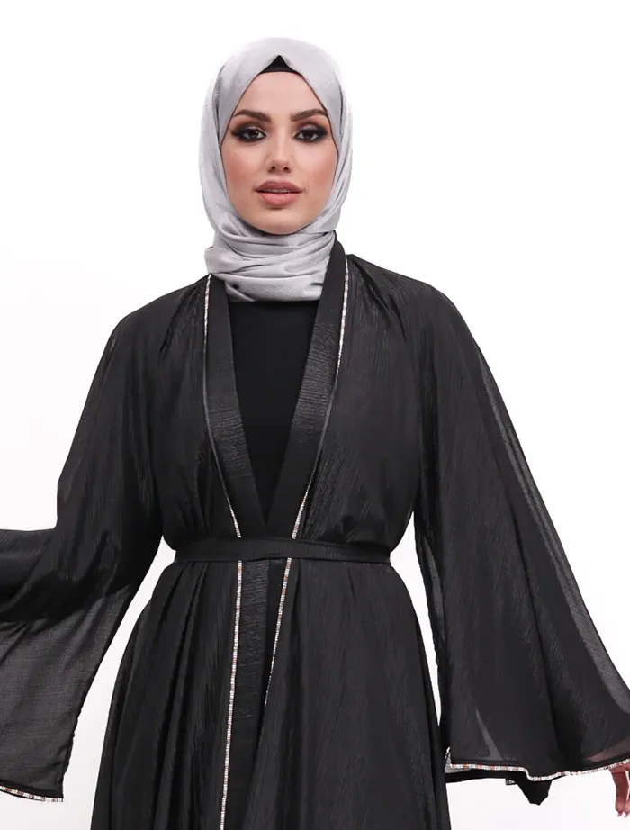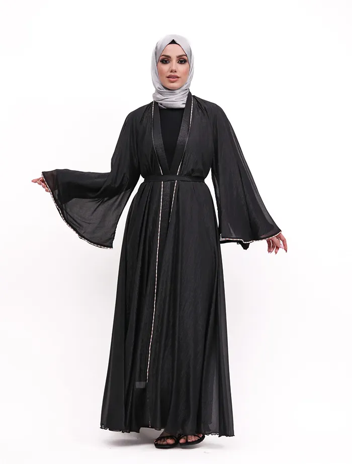 The organza fabric beautifully enhances the full-flare umbrella silhouette. The two-tone diamante trim, which runs along the front and edges of the flared cuffs, adds a striking touch to this standout piece. An Longsleeve inner slip is included, and a belt is attached for a secure fit.