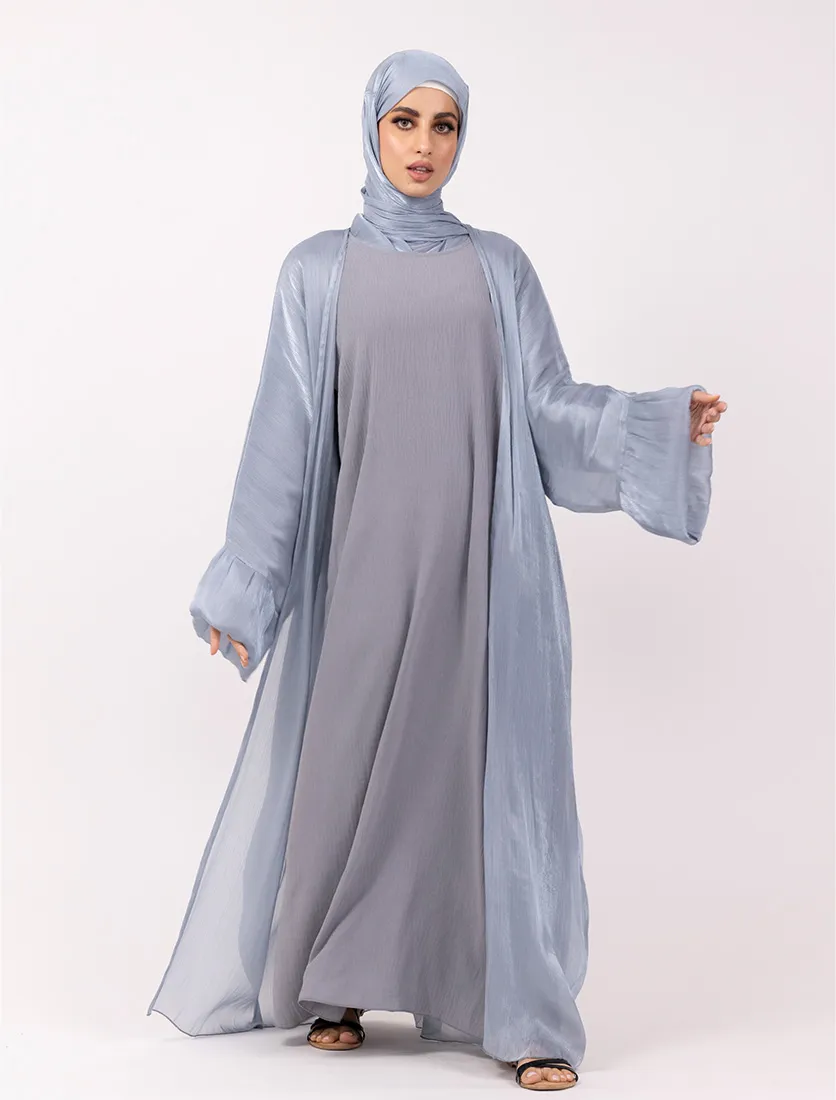 Make a graceful statement with this flowing kaftan set, featuring a billowing silhouette crafted from soft, lightweight fabric with a crinkle pleat texture. The set includes a matching inner slip and hijab, offering complete coordination for a polished look. Designed with dramatic wide sleeves and inner belt fastening for adjustable shaping, it balances elegance with comfort—ideal for special occasions or elevated everyday wear.