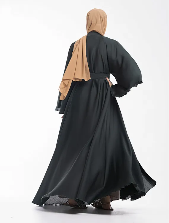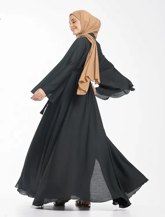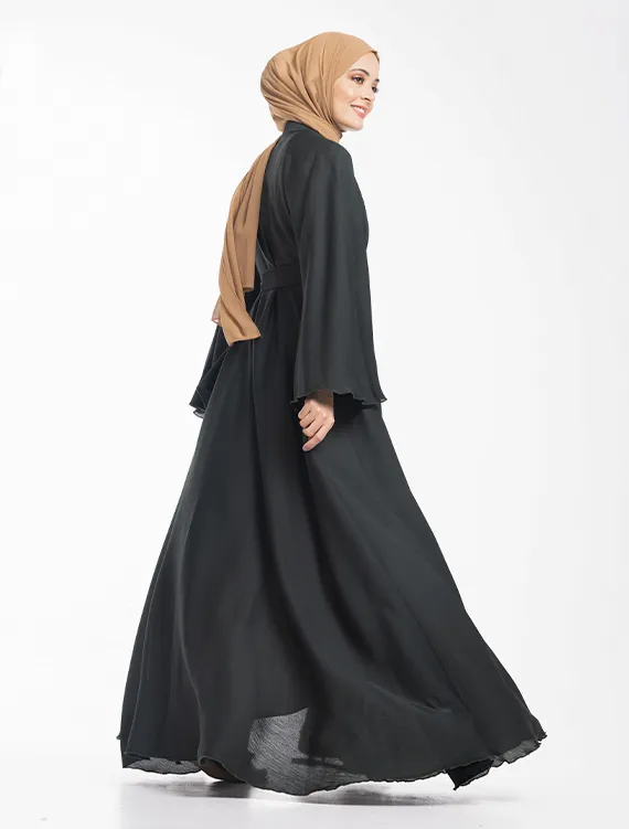 The Nida Crinkle fabric compliments the full flare cut umbrella styling. Other detailing includes flared sleeves, V-neckline and hidden press buttons running down the front.