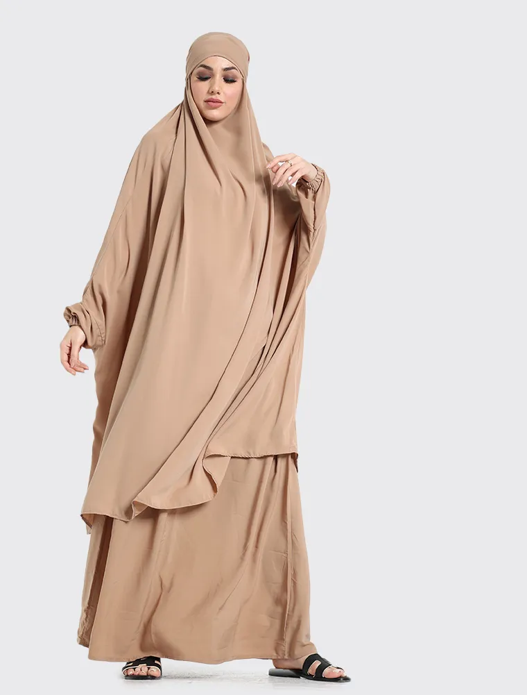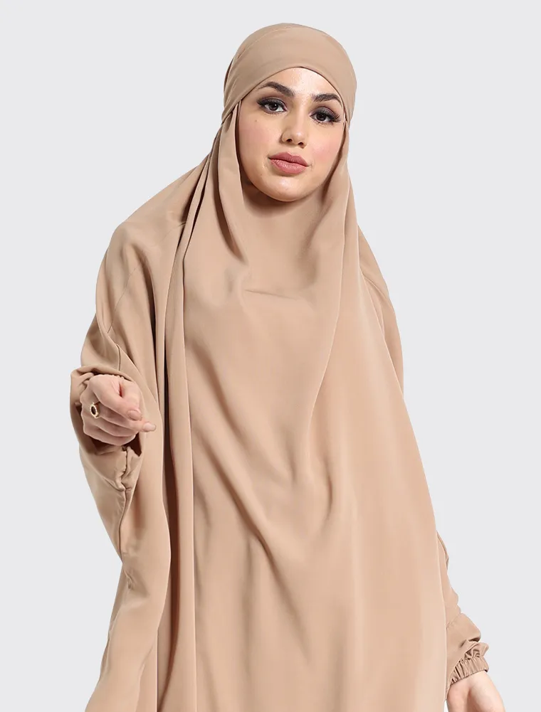 This half-jilbab set is thoughtfully designed with a chin-covering style and a tie-back headband for a secure and comfortable fit. The elasticated cuffs make performing wudhu easy and convenient, while the slightly flared skirt features an elasticated waistband to ensure a flexible fit for sizes 8 to 16. Sold as a free-size set, this khimar offers both modesty and ease for everyday wear.