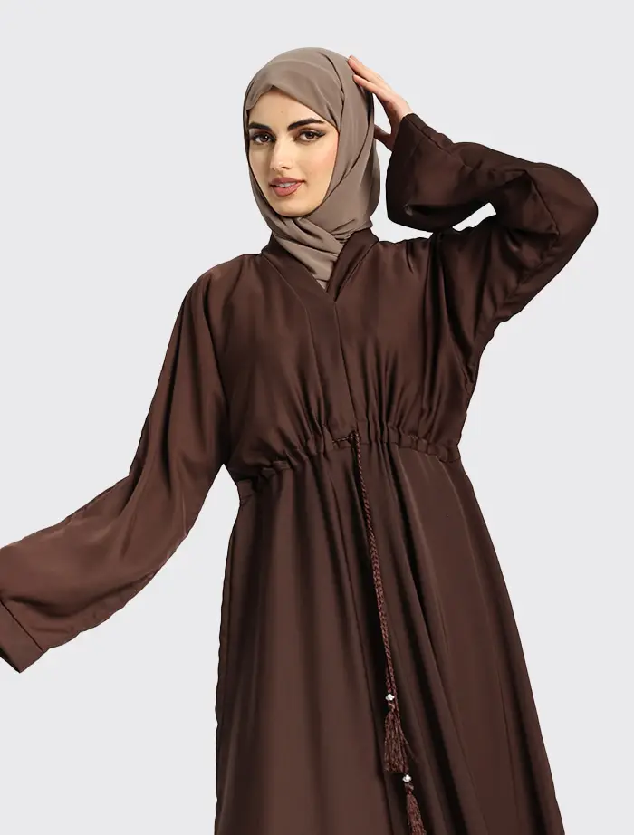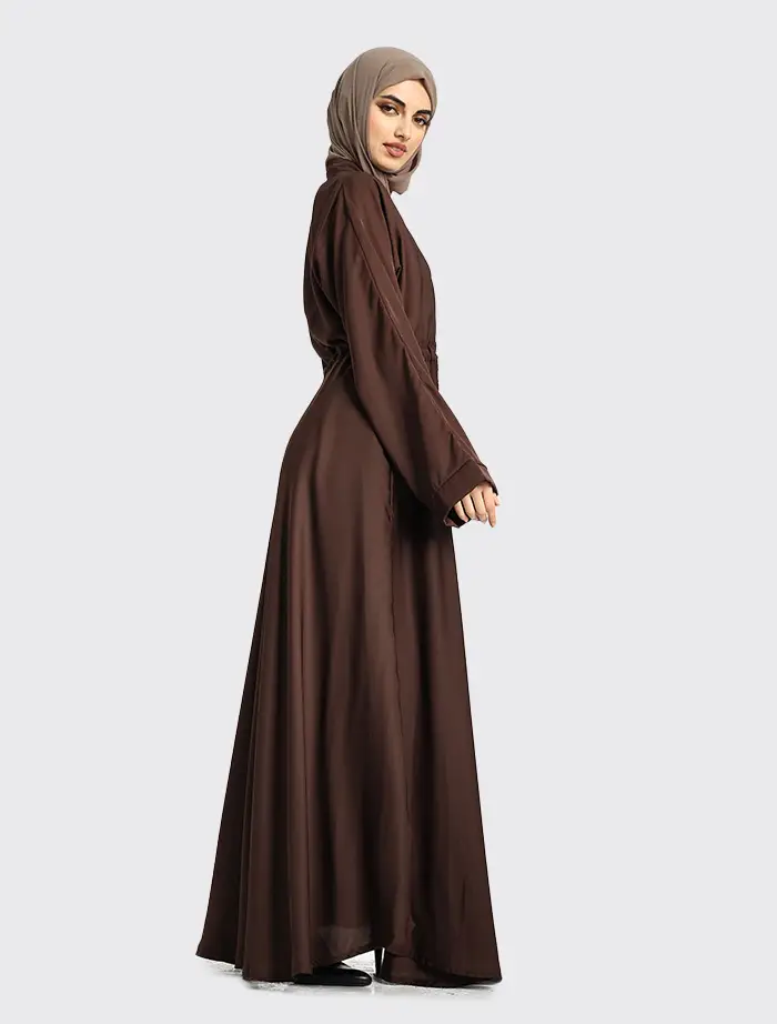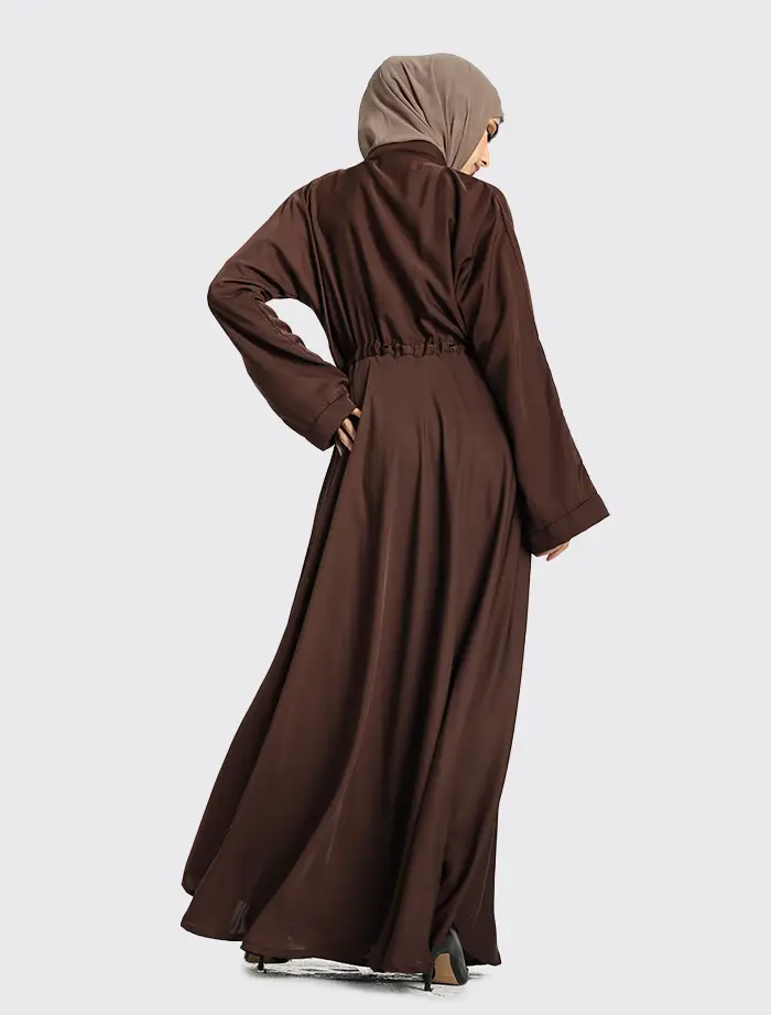 The style features a V-neckline and a draw cord on the waistline to achieve a more structured fit. The Nida fabric compliments the full flare cut umbrella bottom.