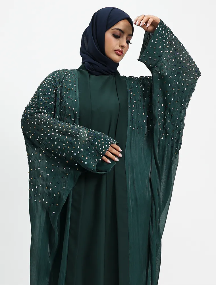 Green Sparkle Crystal Sheer Overlay Abaya