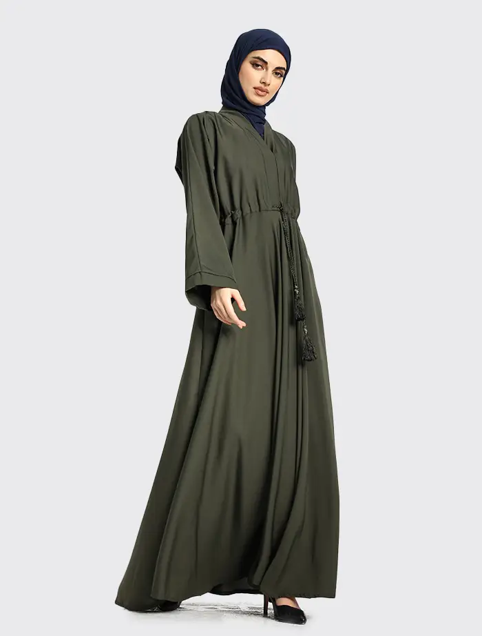 The style features a V-neckline and a draw cord on the waistline to achieve a more structured fit. The Nida fabric compliments the full flare cut umbrella bottom.