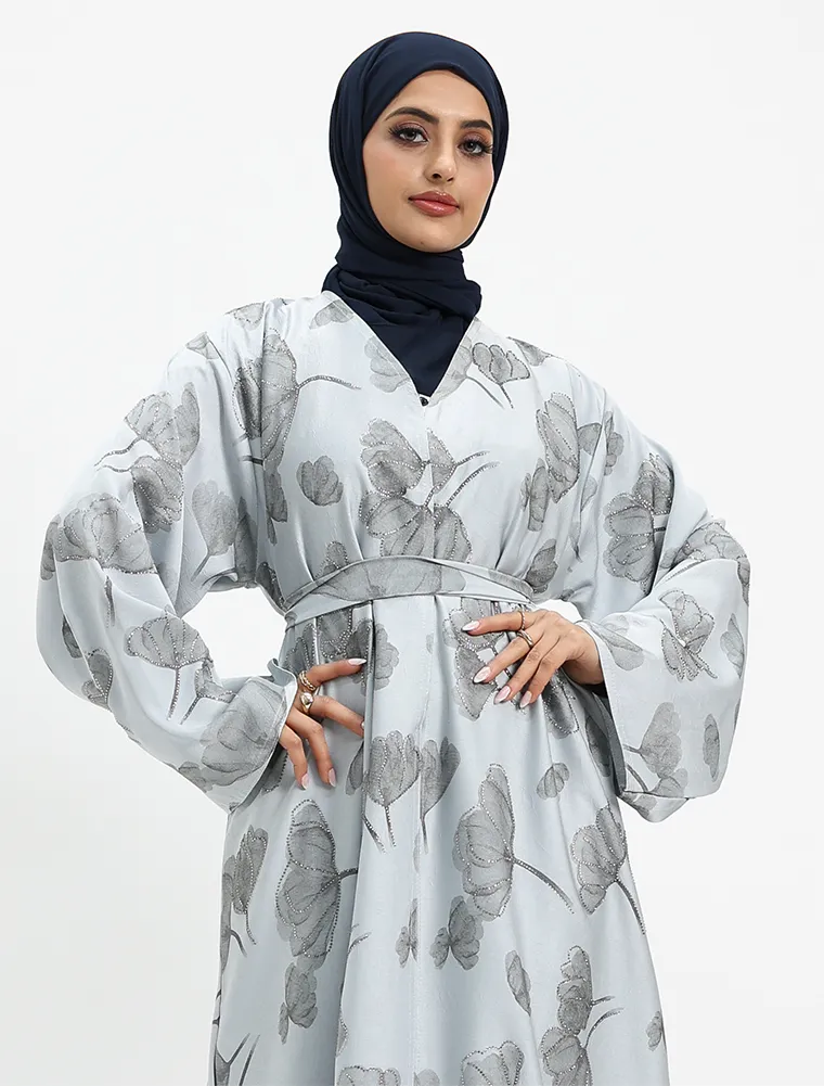 Elevate your modest wardrobe with this luxury satin open abaya, beautifully designed with Inara-inspired floral prints and delicate diamante detailing along the flower outlines for a subtle shimmer. Crafted from smooth, high-quality satin, this abaya offers a graceful drape and an elegant finish.