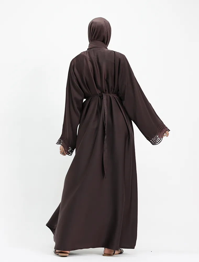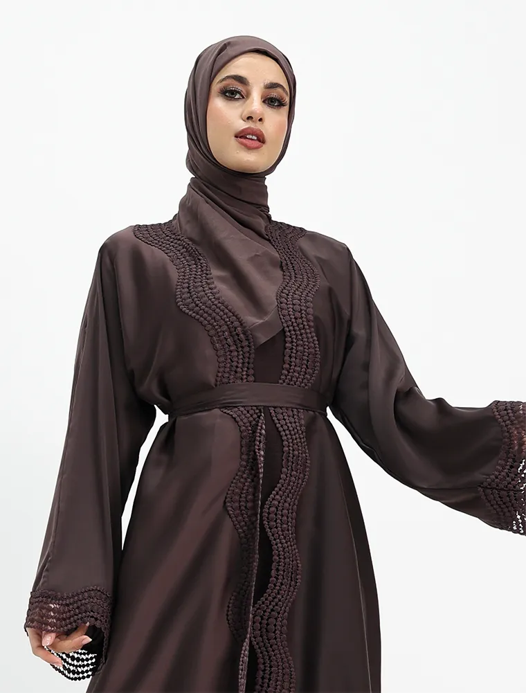 Crafted from luxurious, lustrous satin, this two-piece abaya set drapes beautifully to create an effortlessly elegant and modest silhouette. Designed for both comfort and sophistication, the flowing outer abaya features delicate Safiya-inspired lace detailing along the front and cuffs, adding a refined and timeless finish.