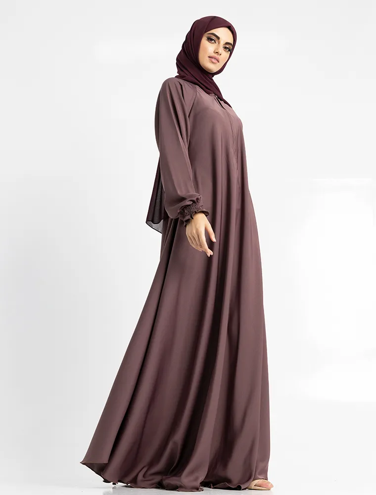 Crafted from premium Nida fabric, this abaya features a full-flare umbrella cut that offers both elegance and comfort. The round neckline is complemented by a concealed front zip for ease of wear, while the sleeves are finished with elasticated cuffs for a modest yet practical touch. Perfect for maternity and everyday wear, this abaya combines effortless style with everyday functionality.