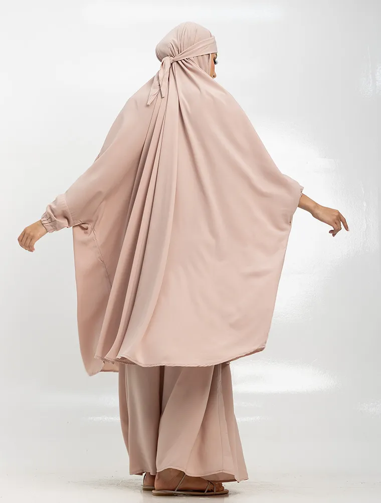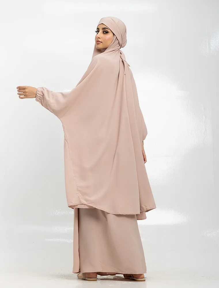 This half-jilbab set is thoughtfully designed with a chin-covering style and a tie-back headband for a secure and comfortable fit. The elasticated cuffs make performing wudhu easy and convenient, while the slightly flared skirt features an elasticated waistband to ensure a flexible fit for sizes 8 to 16. Sold as a free-size set, this khimar offers both modesty and ease for everyday wear.