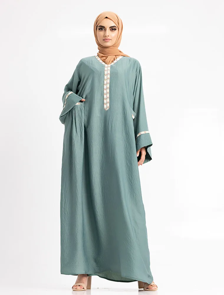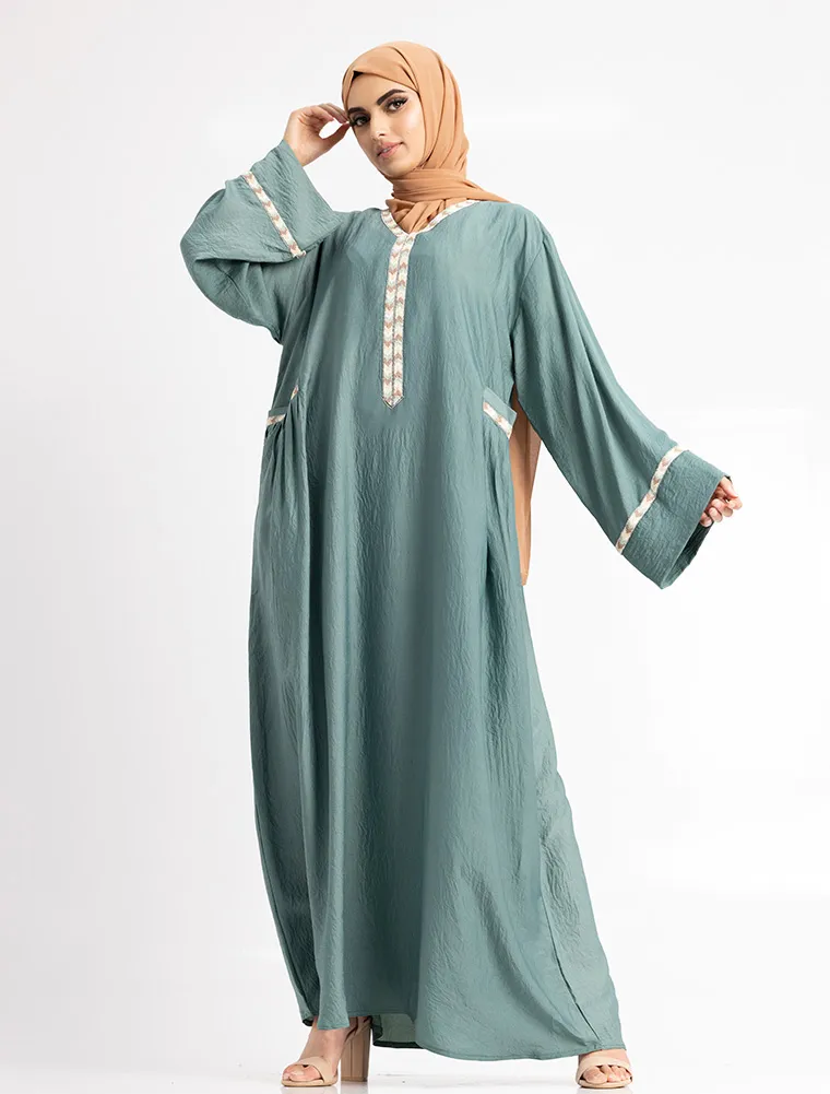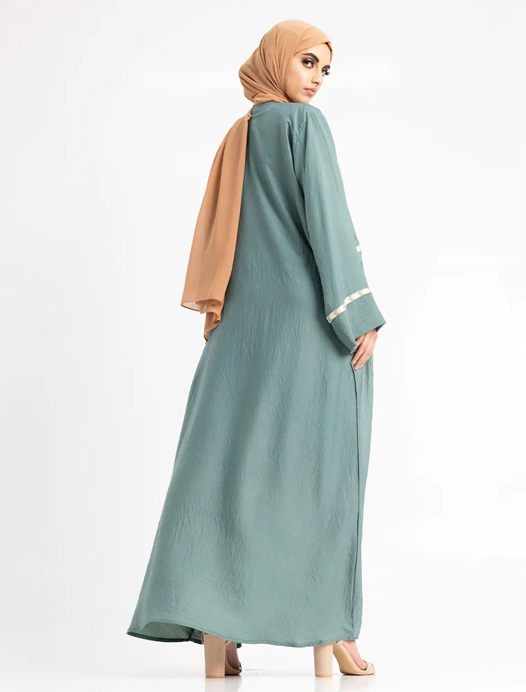 Crafted from a smooth, satin-feel fabric, this abaya drapes effortlessly to create an elegant yet comfortable silhouette. Designed with a relaxed fit for ease of movement, it features discreet front pockets for everyday practicality without compromising on style.