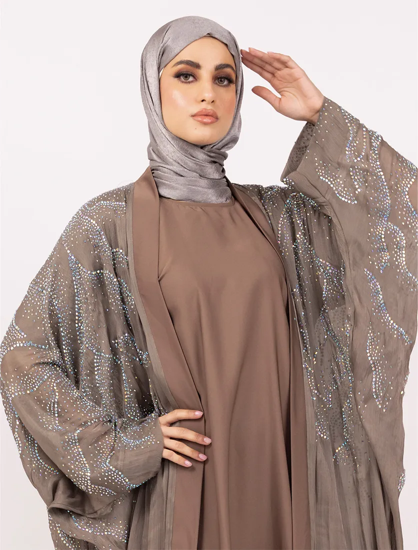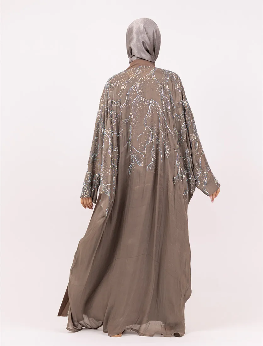 Mocha Crystal Embellished Sheer Overlay Abaya