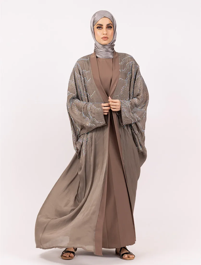 Home / Mocha Crystal Embellished Sheer Overlay Abaya