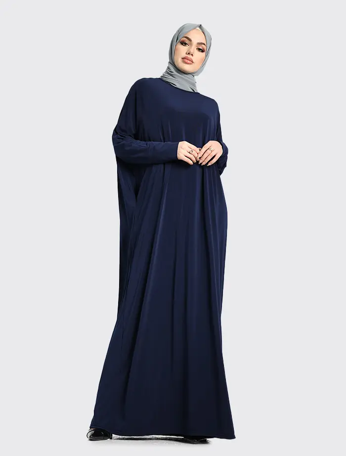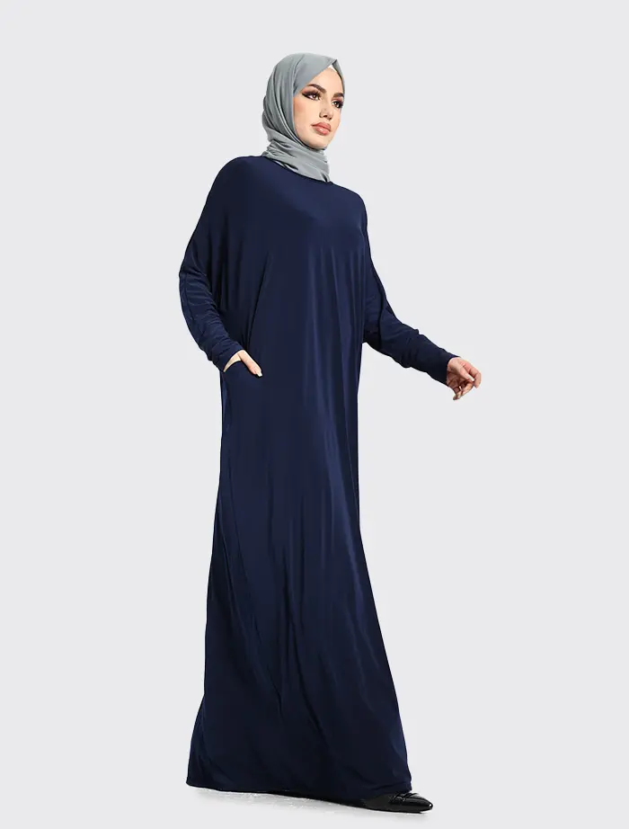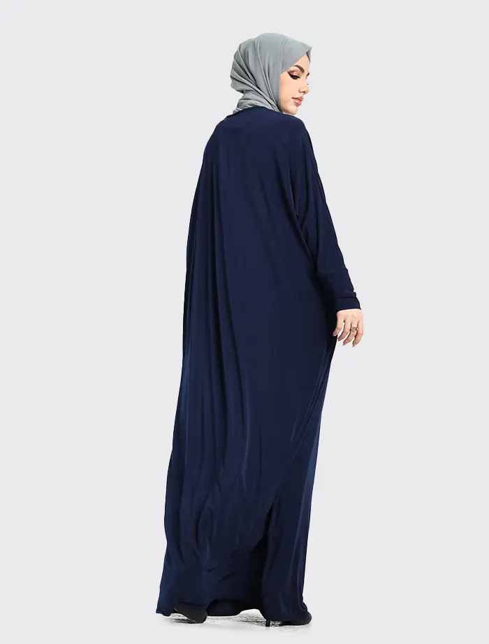 Navy Batwing Jersey Abaya features loose cut fitting with stretchy cuffs at the