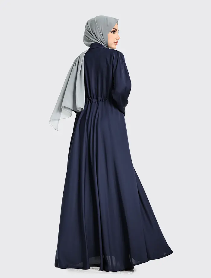 The style features a V-neckline and a draw cord on the waistline to achieve a more structured fit. The Nida fabric compliments the full flare cut umbrella bottom.
