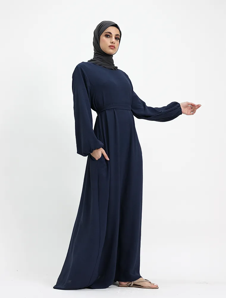 Another basic abaya which you can't go wrong with, although simple it will meet your expectations for your everyday comfort. This dress features an A-line cut flared bottom with pockets on both sides for your essentials, elasticated cuffs to give a slight puff look. A separate belt is included to give a more structured look or you can just opt for the more casual look without it.
