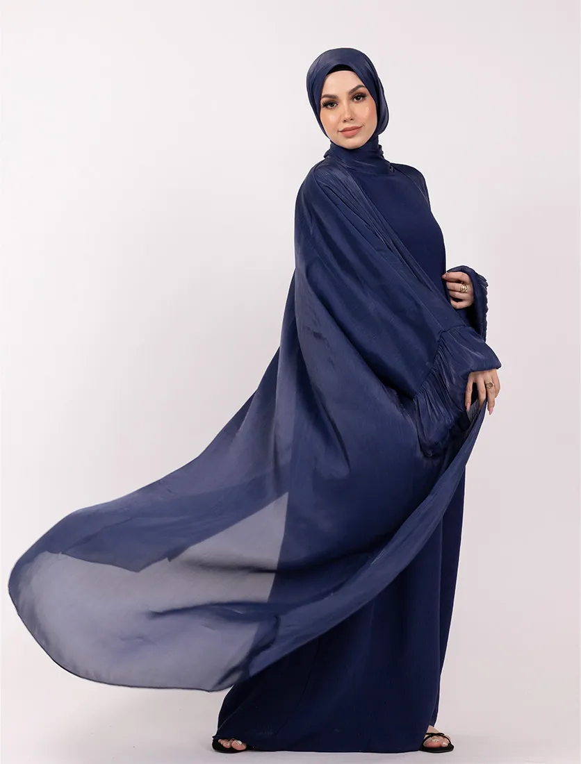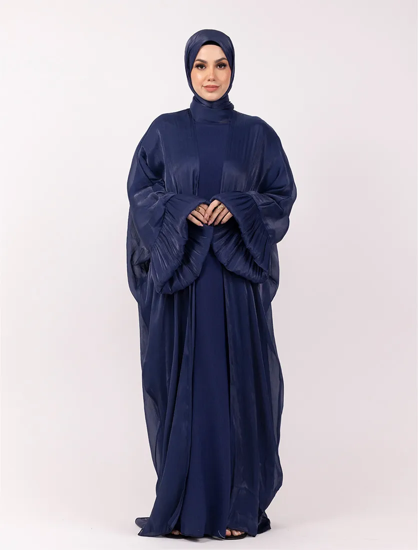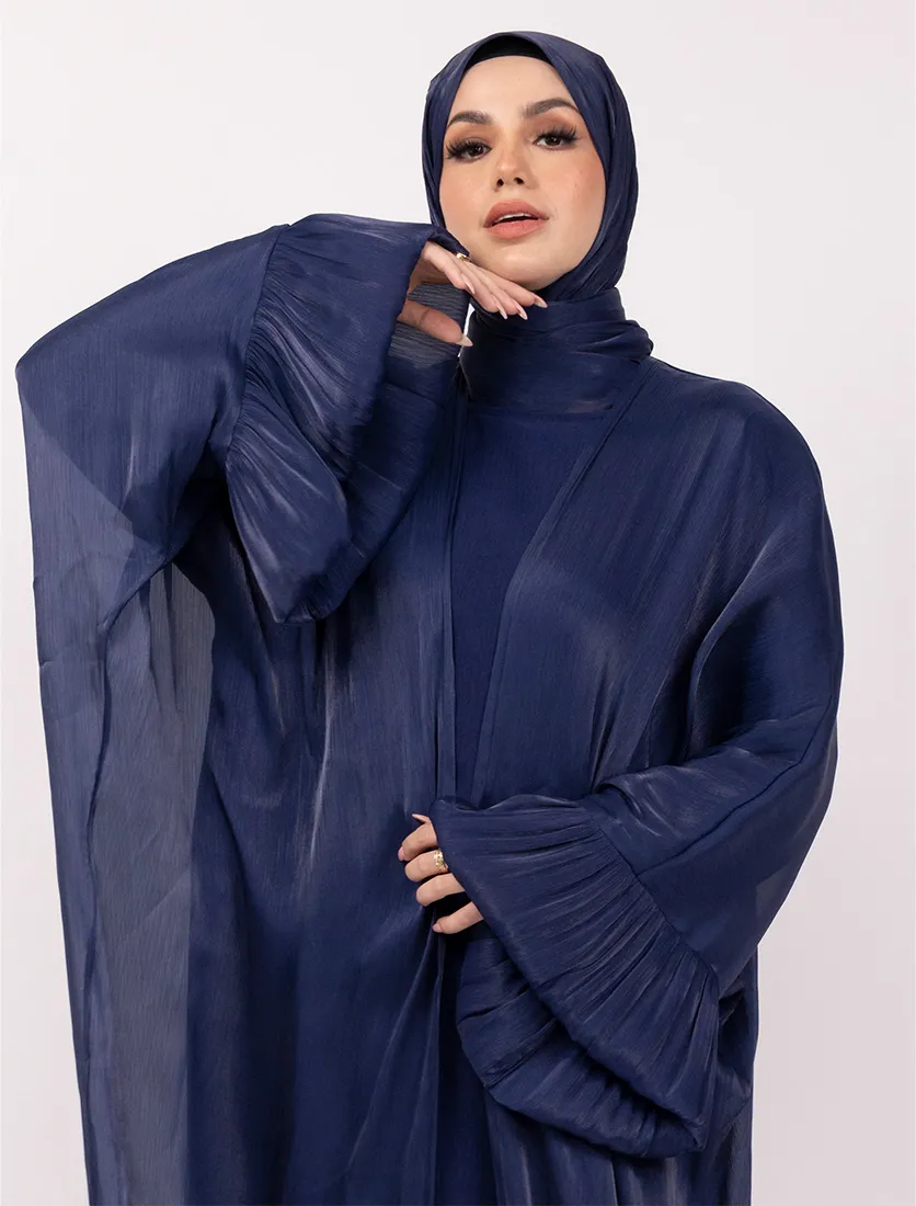 Make a graceful statement with this flowing kaftan set, featuring a billowing silhouette crafted from soft, lightweight fabric with a crinkle pleat texture. The set includes a matching inner slip and hijab, offering complete coordination for a polished look. Designed with dramatic wide sleeves and inner belt fastening for adjustable shaping, it balances elegance with comfort—ideal for special occasions or elevated everyday wear.