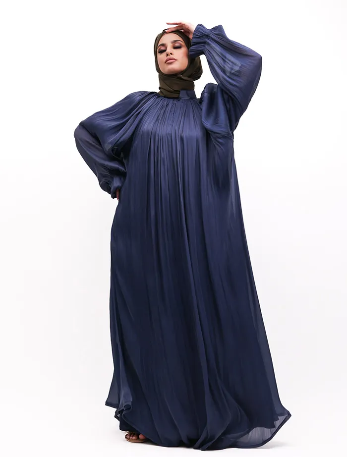 An organza umbrella cut abaya with a separate lining garment typically features an elegant and flowing silhouette due to the umbrella cut. Features a collar, adding a structured element to the abaya. Has a zip opening at the top, making it easy to wear and remove. Balloon sleeves with elasticated cuffs, giving a puffy and stylish look.
