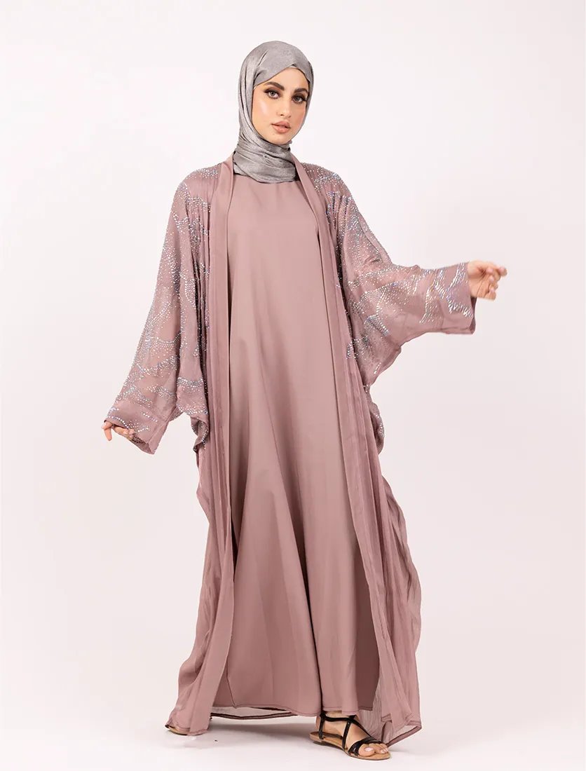 Make a lasting impression with this show-stopping Crystal-Embellished Abaya, crafted for evenings that call for elegance and glamor. Featuring a unique sheer overlay adorned with glimmering crystal embellishments, this abaya is a perfect fusion of modesty and statement style.