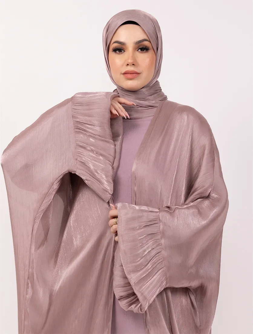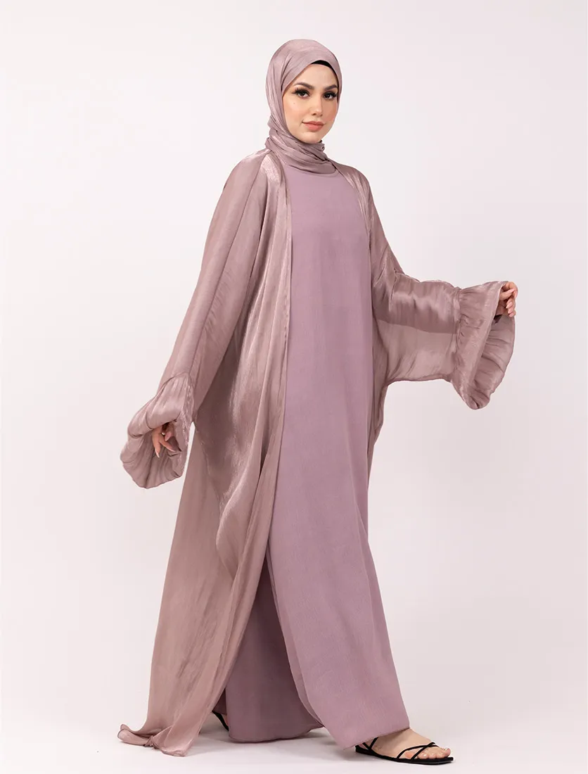 Make a graceful statement with this flowing kaftan set, featuring a billowing silhouette crafted from soft, lightweight fabric with a crinkle pleat texture. The set includes a matching inner slip and hijab, offering complete coordination for a polished look. Designed with dramatic wide sleeves and inner belt fastening for adjustable shaping, it balances elegance with comfort—ideal for special occasions or elevated everyday wear.