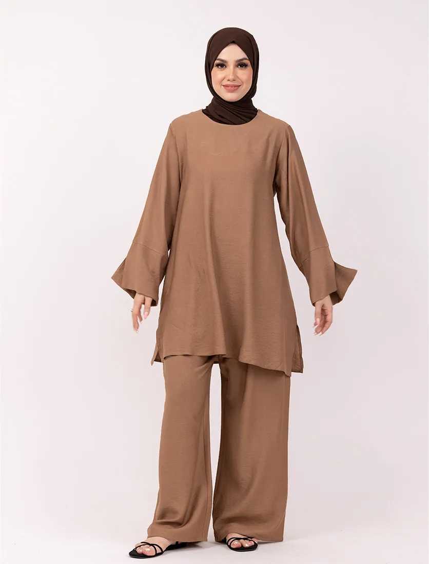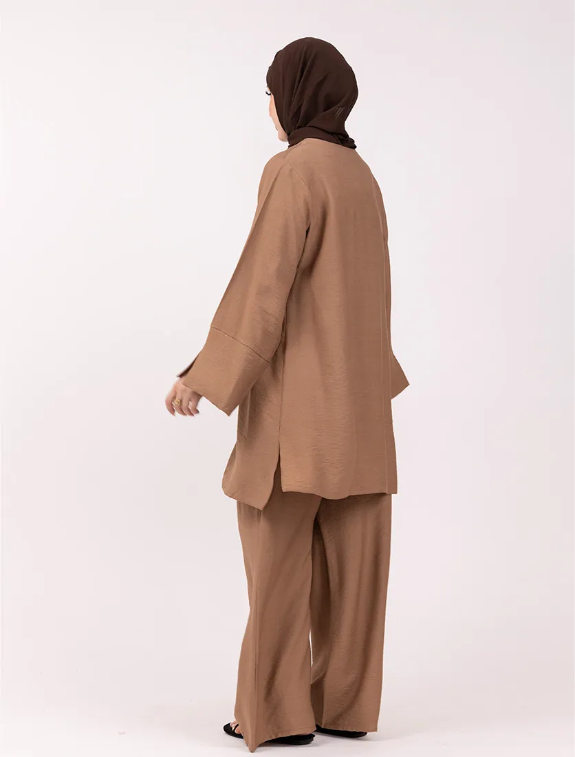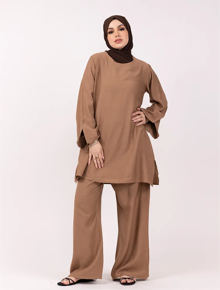 Step into effortless sophistication with this stylish two-piece co-ord set. Crafted from a soft textured fabric, the top features a relaxed fit with subtle split cuff and side slits, offering both comfort and contemporary flair. Paired with wide-leg trousers for a fluid, flattering silhouette, this set is ideal for casual elegance or elevated everyday wear. Wear as a complete look or mix and match for versatile styling.
