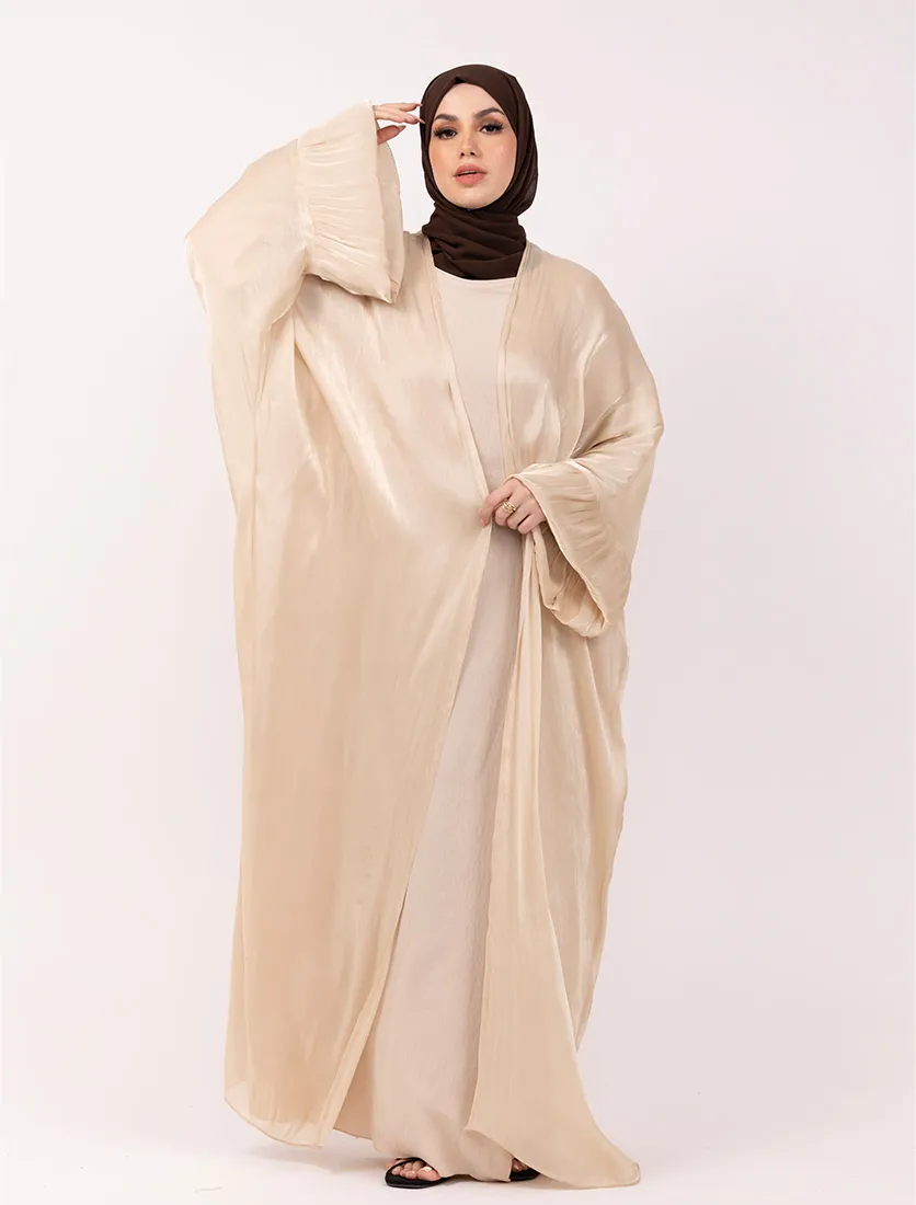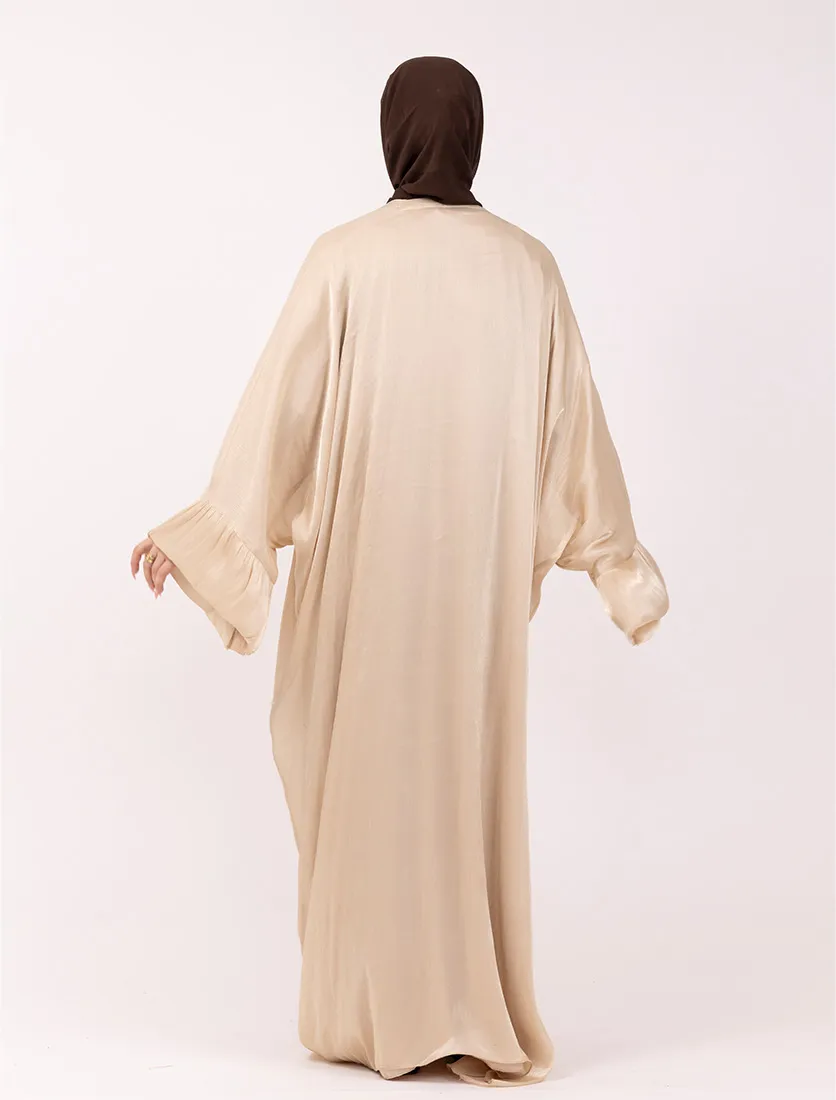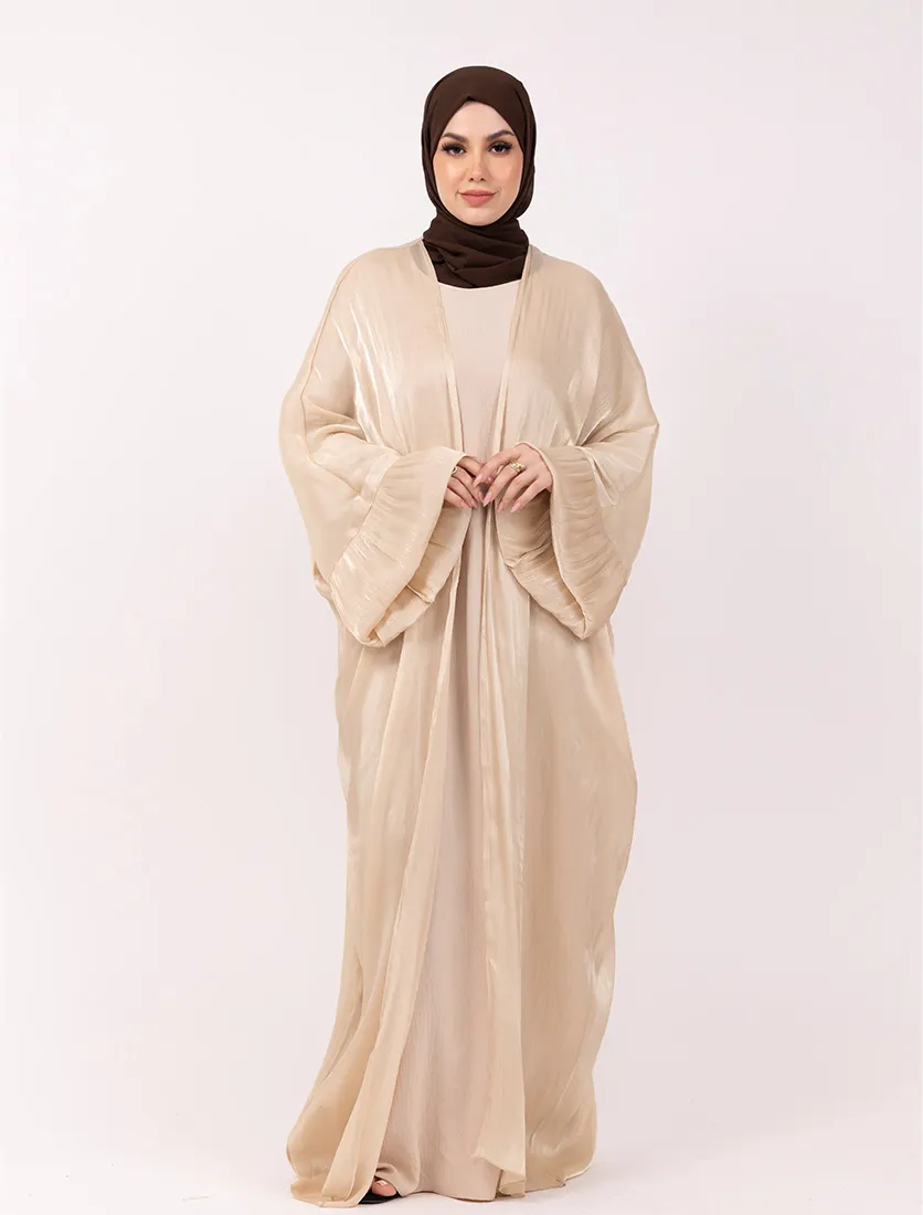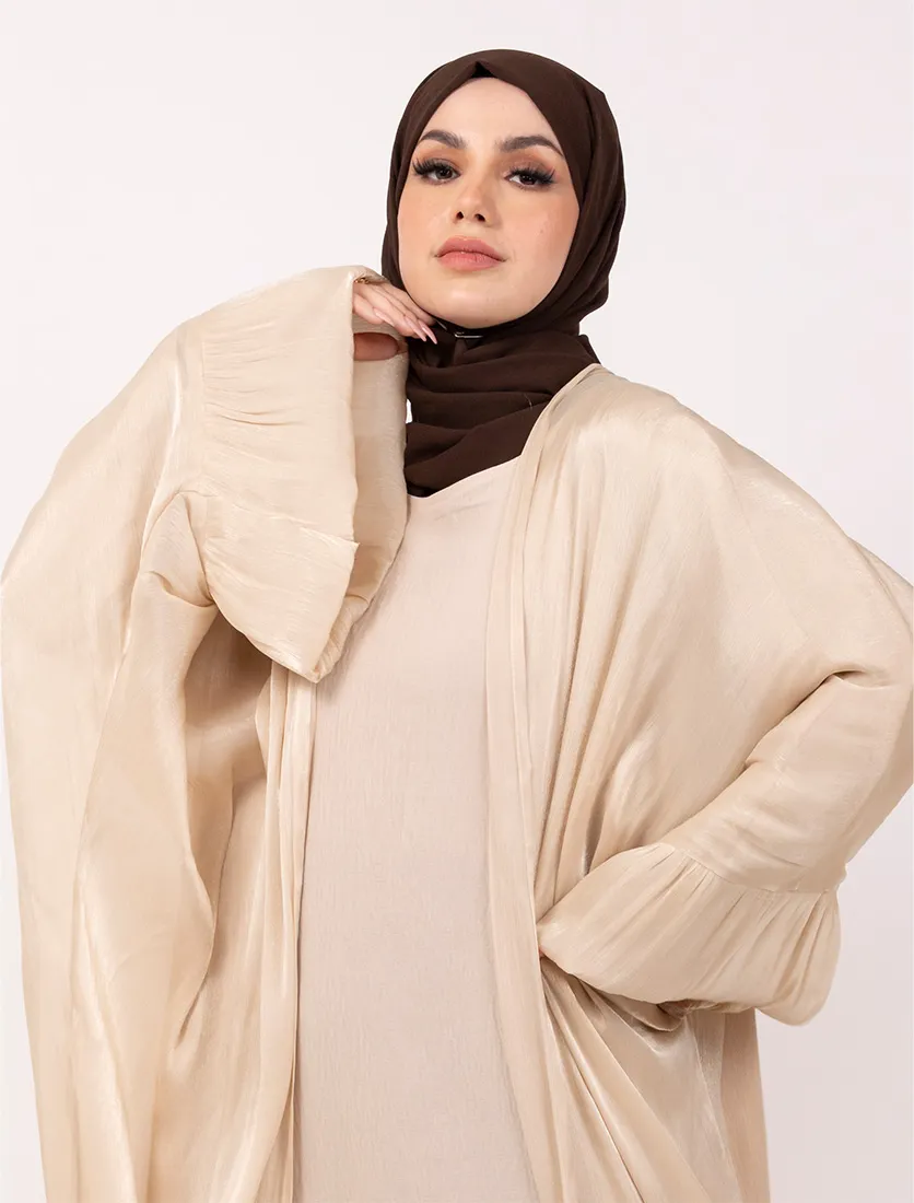 Make a graceful statement with this flowing kaftan set, featuring a billowing silhouette crafted from soft, lightweight fabric with a crinkle pleat texture. The set includes a matching inner slip and hijab, offering complete coordination for a polished look. Designed with dramatic wide sleeves and inner belt fastening for adjustable shaping, it balances elegance with comfort—ideal for special occasions or elevated everyday wear.